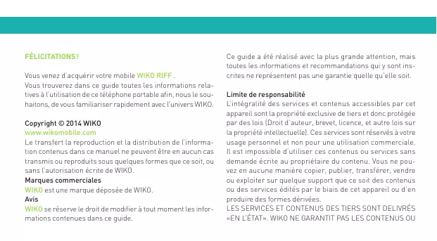 FÉLICITATIONS ! Vous venez d’acquérir votre mobile WIKO RIFF . Vous trouverez dans ce guide toutes les informations relatives à l’utilisation de ce téléphone portable afin, nous le souhaitons, de vous familiariser rapidement avec l’univers WIKO. Copyright © 2014 WIKO www.wikomobile.com Le transfert la reproduction et la distribution de l’information contenus dans ce manuel ne peuvent être en aucun cas transmis ou reproduits sous quelques formes que ce soit, ou sans l’autorisation écrite de WIKO. Marques commerciales WIKO est une marque déposée de WIKO. Avis WIKO se réserve le droit de modifier à tout moment les informations contenues dans ce guide. Ce guide a été réalisé avec la plus grande attention, mais toutes les informations et recommandations qui y sont inscrites ne représentent pas une garantie quelle qu’elle soit. Limite de responsabilité L’intégralité des services et contenus accessibles par cet appareil sont la propriété exclusive de tiers et donc protégée par des lois (Droit d’auteur, brevet, licence, et autre lois sur la propriété intellectuelle). Ces services sont réservés à votre usage personnel et non pour une utilisation commerciale. Il est impossible d’utiliser ces contenus ou services sans demande écrite au propriétaire du contenu. Vous ne pouvez en aucune manière copier, publier, transférer, vendre ou exploiter sur quelque support que ce soit des contenus ou des services édités par le biais de cet appareil ou d’en produire des formes dérivées. LES SERVICES ET CONTENUS DES TIERS SONT DELIVRÉS «EN L’ÉTAT». WIKO NE GARANTIT PAS LES CONTENUS OU SERVICES AINSI DELIVRÉS, QUE CE SOIT DE MANIERE EXPRESSE OU IMPLICITE, A QUELQUE FIN QUE CE SOIT AINSI QUE LES GARANTIES QUALITÉ MARCHANDE ET D’ADÉQUATION A UN USAGE PARTICULIER. WIKO N’ASSURE PAS LA GARANTIE DE L’EXACTITUDE, LA VALIDITÉ, LA LÉGALITE OU L’EXHAUSTIVITE DES CONTENUS OU SERVICES FOURNIS PAR CET APPAREIL. WIKO NE SERA PAS RESPONSABLE EN CAS DE NÉGLIGENCE, QUE CE SOIT AU NIVEAU DE LA RESPONSABILITÉ CONTRACTUELLE OU DÉLICTUELLE,