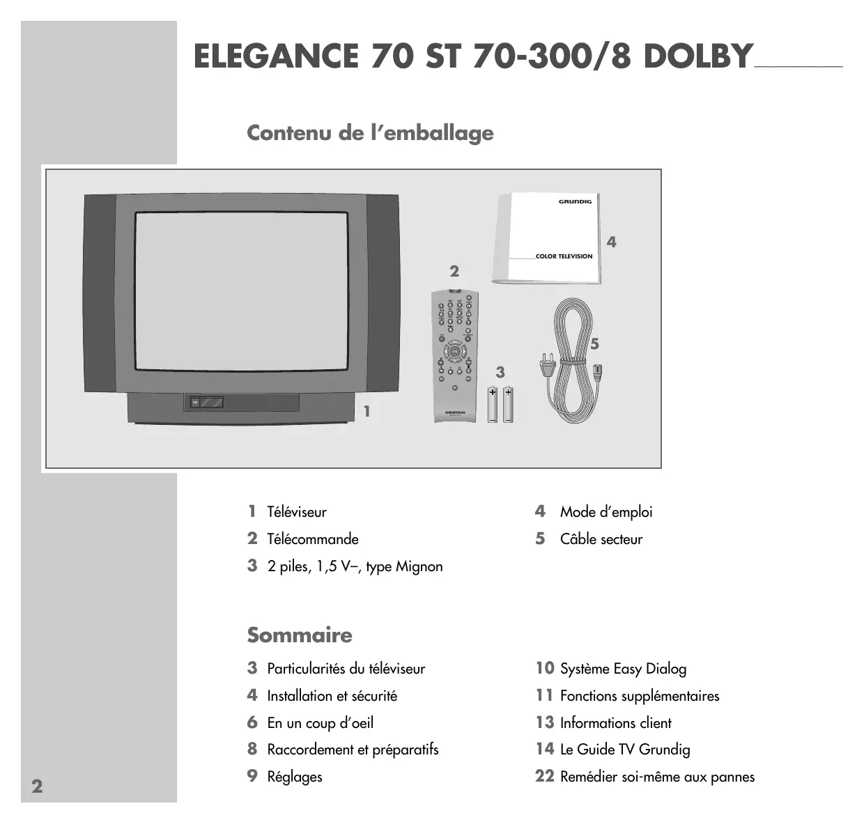 Tele Pilot 150 C 1 Téléviseur 4 Mode d’emploi 2 Télécommande 5 Câble secteur 3 2 piles, 1,5 V–, type Mignon Sommaire