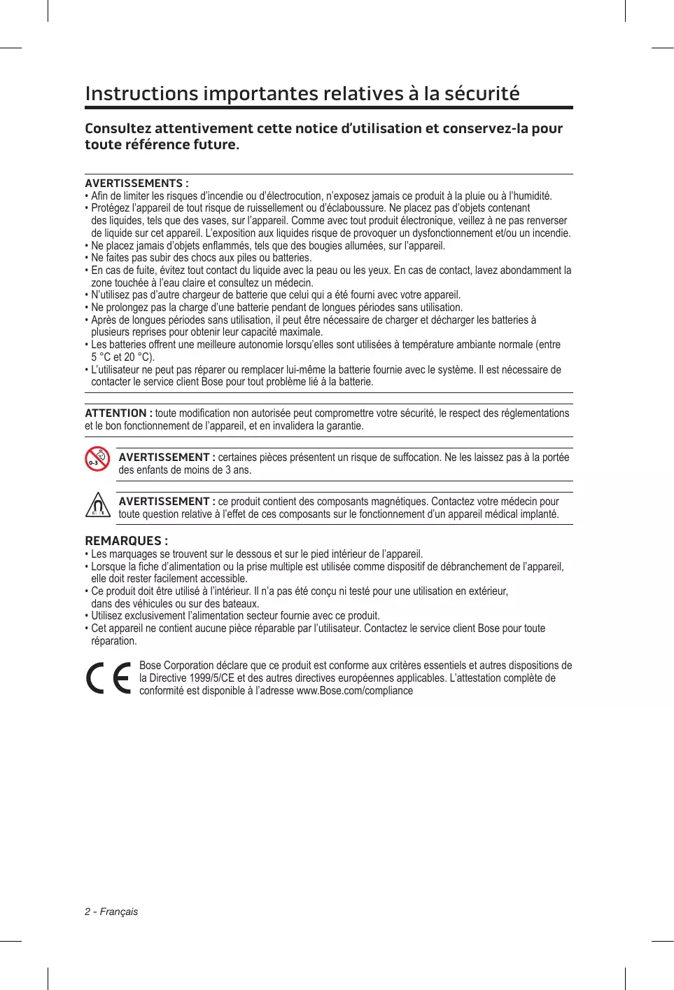 - L'utilisateur ne peut pas réparer ou remplaner lui-même la batterie fournie avec le système. Il est nécessaire de contacter le service client Bose pour tout problème lié à la batterie.