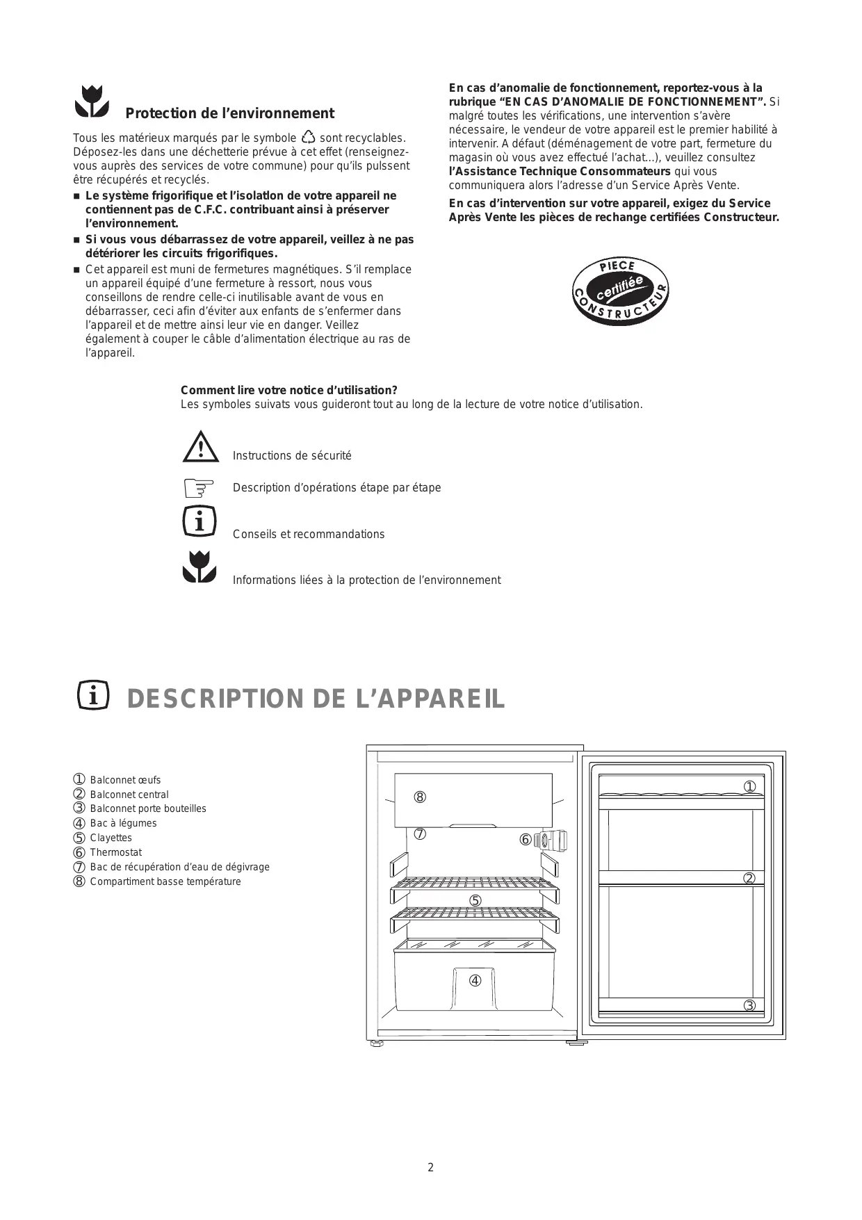 En cas d’anomalie de fonctionnement, reportez-vous à la rubrique “EN CAS D’ANOMALIE DE FONCTIONNEMENT”. Si malgré toutes les vérifications, une intervention s’avère nécessaire, le vendeur de votre appareil est le premier habilité à intervenir. A défaut (déménagement de votre part, fermeture du magasin où vous avez effectué l’achat...), veuillez consultez l’Assistance Technique Consommateurs qui vous communiquera alors l’adresse d’un Service Après Vente. Protection de l’environnement Tous les matérieux marqués par le symbole sont recyclables. Déposez-les dans une déchetterie prévue à cet effet (renseignezvous auprès des services de votre commune) pour qu’ils pulssent être récupérés et recyclés. ■ Le système frigorifique et l’isolatlon de votre appareil ne contiennent pas de C.F.C. contribuant ainsi à préserver l’environnement. ■ Si vous vous débarrassez de votre appareil, veillez à ne pas détériorer les circuits frigorifiques. ■ Cet appareil est muni de fermetures magnétiques. S’il remplace un appareil équipé d’une fermeture à ressort, nous vous conseillons de rendre celle-ci inutilisable avant de vous en débarrasser, ceci afin d’éviter aux enfants de s’enfermer dans l’appareil et de mettre ainsi leur vie en danger. Veillez également à couper le câble d’alimentation électrique au ras de l’appareil. En cas d’intervention sur votre appareil, exigez du S ervice Après Vente Ies pièces de rechange certifiées Constructeur. Comment lire votre notice d’utilisation? Les symboles suivats vous guideront tout au long de la lecture de votre notice d’utilisation. Instructions de sécurité