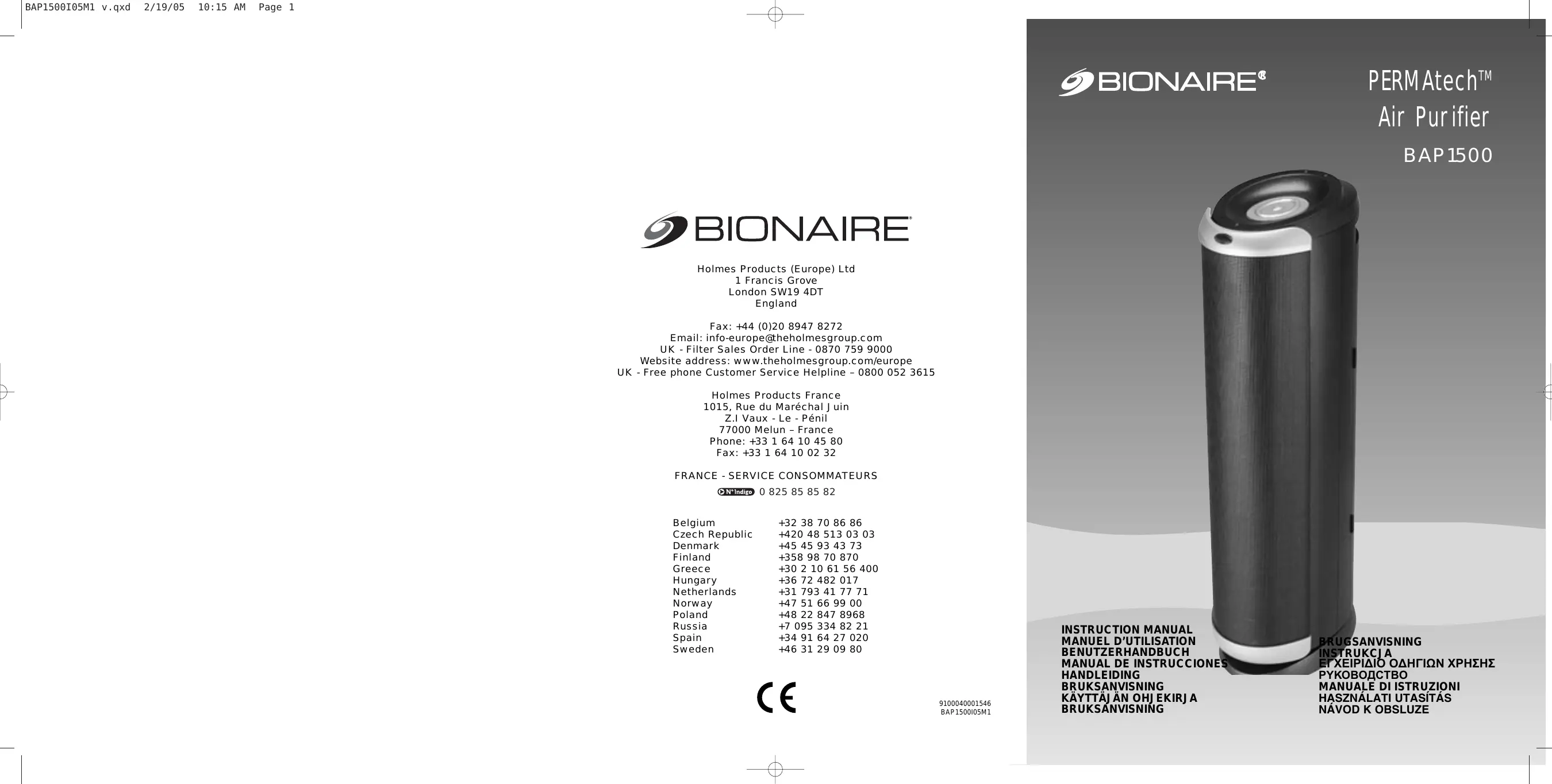 BAP 1550-I - Purificateur d'air BIONAIRE - Notice d'utilisation et mode d'emploi gratuit