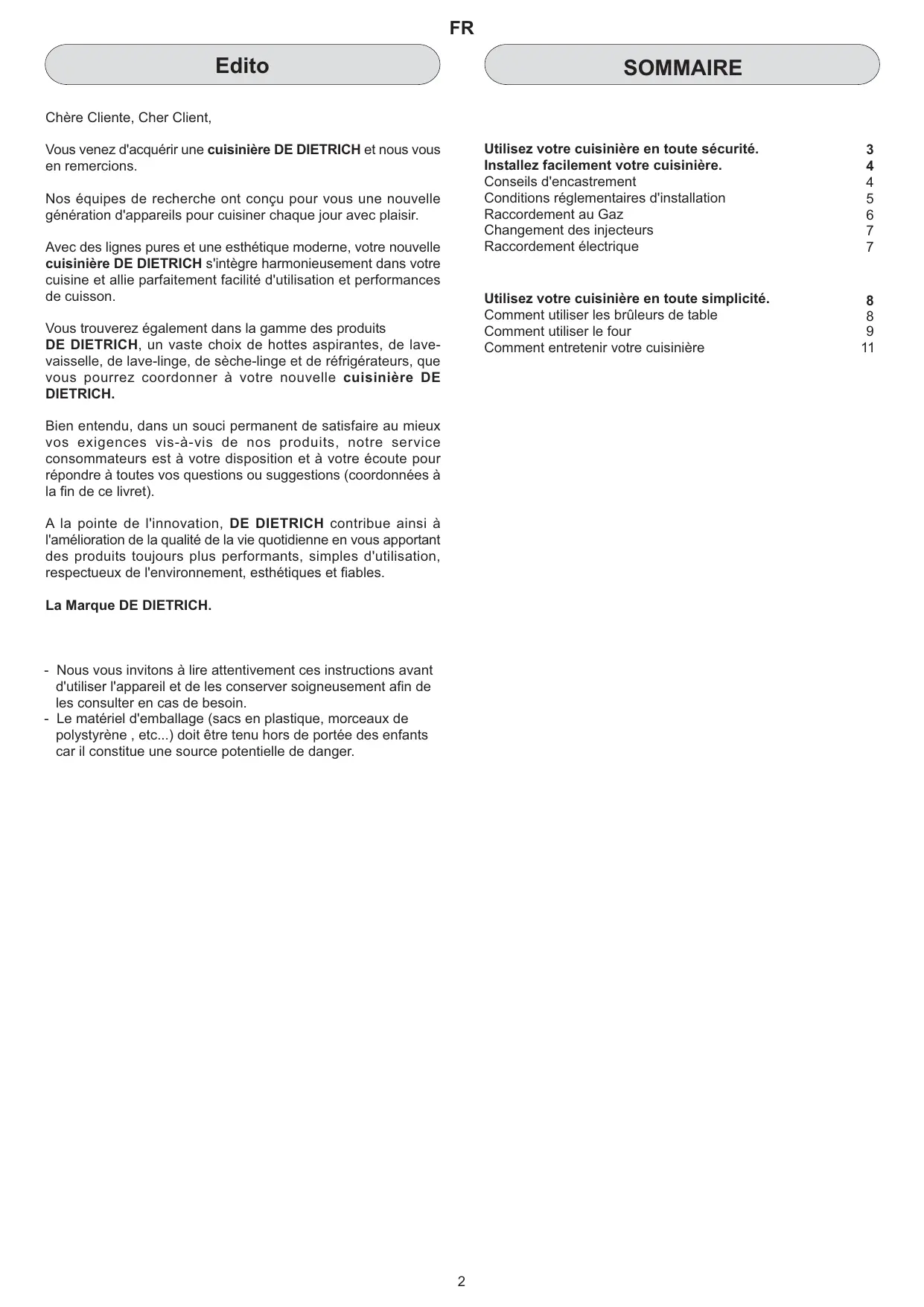 Vous venez d'acquérir une cuisinière DE DIETRICH et nous vous en remercions. Nos équipes de recherche ont conçu pour vous une nouvelle génération d'appareils pour cuisiner chaque jour avec plaisir. Avec des lignes pures et une esthétique moderne, votre nouvelle cuisinière DE DIETRICH s'intègre harmonieusement dans votre cuisine et allie parfaitement facilité d'utilisation et performances de cuisson.