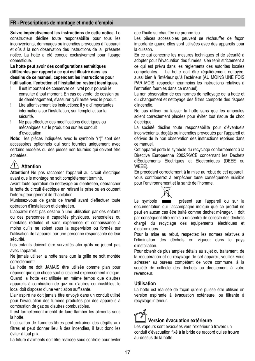 que l’huile surchauffée ne prenne feu. Les pièces accessibles peuvent se réchauffer de façon importante quand elles sont utilisées avec des appareils pour la cuisson. En ce qui concerne les mesures techniques et de sécurité à adopter pour l’évacuation des fumées, s’en tenir strictement à ce qui est prévu dans les règlements des autorités locales compétentes. La hotte doit être régulièrement nettoyée, aussi bien à l’intérieur qu’à l’extérieur (AU MOINS UNE FOIS PAR MOIS, respecter néanmoins les instructions relatives à l’entretien fournies dans ce manuel). La non observation de ces normes de nettoyage de la hotte et du changement et nettoyage des filtres comporte des risques d’incendie. Ne pas utiliser ou laisser la hotte sans que les ampoules soient correctement placées pour éviter tout risque de choc électrique. La société décline toute responsabilité pour d’éventuels inconvénients, dégâts ou incendies provoqués par l’appareil et dérivés de la non observation des instructions reprises dans ce manuel. Cet appareil porte le symbole du recyclage conformément à la Directive Européenne 2002/96/CE concernant les Déchets d’Équipements Électriques et Électroniques (DEEE ou WEEE). En procédant correctement à la mise au rebut de cet appareil, vous contribuerez à empêcher toute conséquence nuisible pour l’environnement et la santé de l’homme.