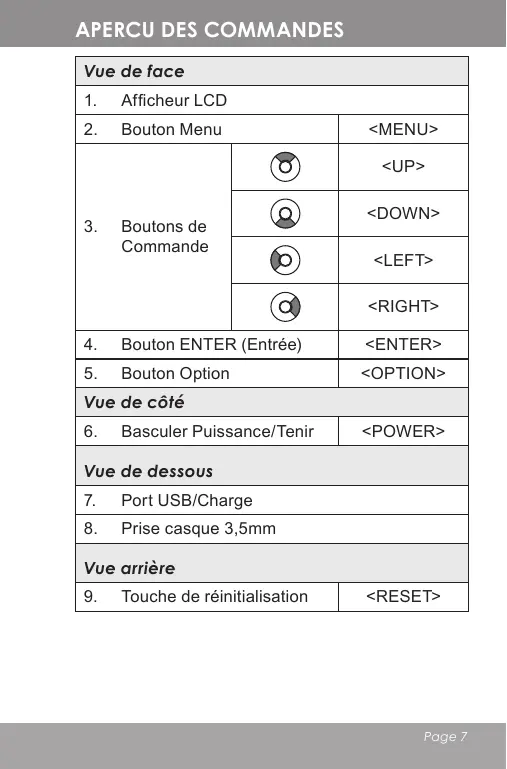 Utilisez un trombone pour appuyer légèrement sur l’orifice de réinitialisation <RESET> situé à l’arrière du lecteur. Désactiver les Commandes (Maintenir) Lorsque le bouton <POWER> est en position « Hold », les commandes de votre lecteur sont désactivées. Les commandes peuvent être désactivées pour éviter de mettre le lecteur en marche ou d’activer les commandes accidentellement lorsque le lecteur est dans votre poche ou sac. Page 9