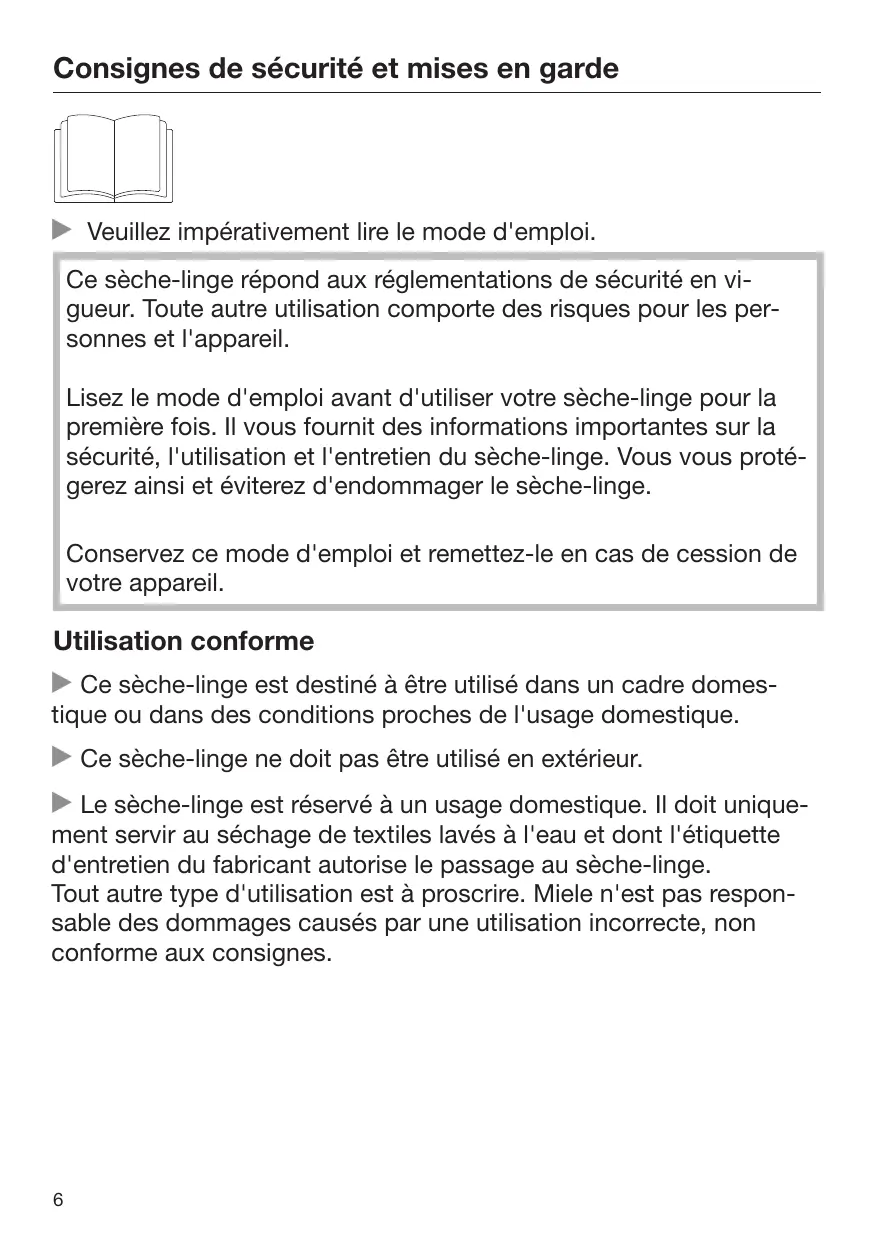 Consignes de sécurité et mises en garde Veuillez impérativement lire le mode d'emploi. Ce sèche-linge répond aux réglementations de sécurité en vigueur. Toute autre utilisation comporte des risques pour les personnes et l'appareil. Lisez le mode d'emploi avant d'utiliser votre sèche-linge pour la première fois. Il vous fournit des informations importantes sur la sécurité, l'utilisation et l'entretien du sèche-linge. Vous vous protégerez ainsi et éviterez d'endommager le sèche-linge. Conservez ce mode d'emploi et remettez-le en cas de cession de votre appareil. Utilisation conforme Ce sèche-linge est destiné à être utilisé dans un cadre domestique ou dans des conditions proches de l'usage domestique. Ce sèche-linge ne doit pas être utilisé en extérieur. Le sèche-linge est réservé à un usage domestique. Il doit uniquement servir au séchage de textiles lavés à l'eau et dont l'étiquette d'entretien du fabricant autorise le passage au sèche-linge. Tout autre type d'utilisation est à proscrire. Miele n'est pas responsable des dommages causés par une utilisation incorrecte, non conforme aux consignes.