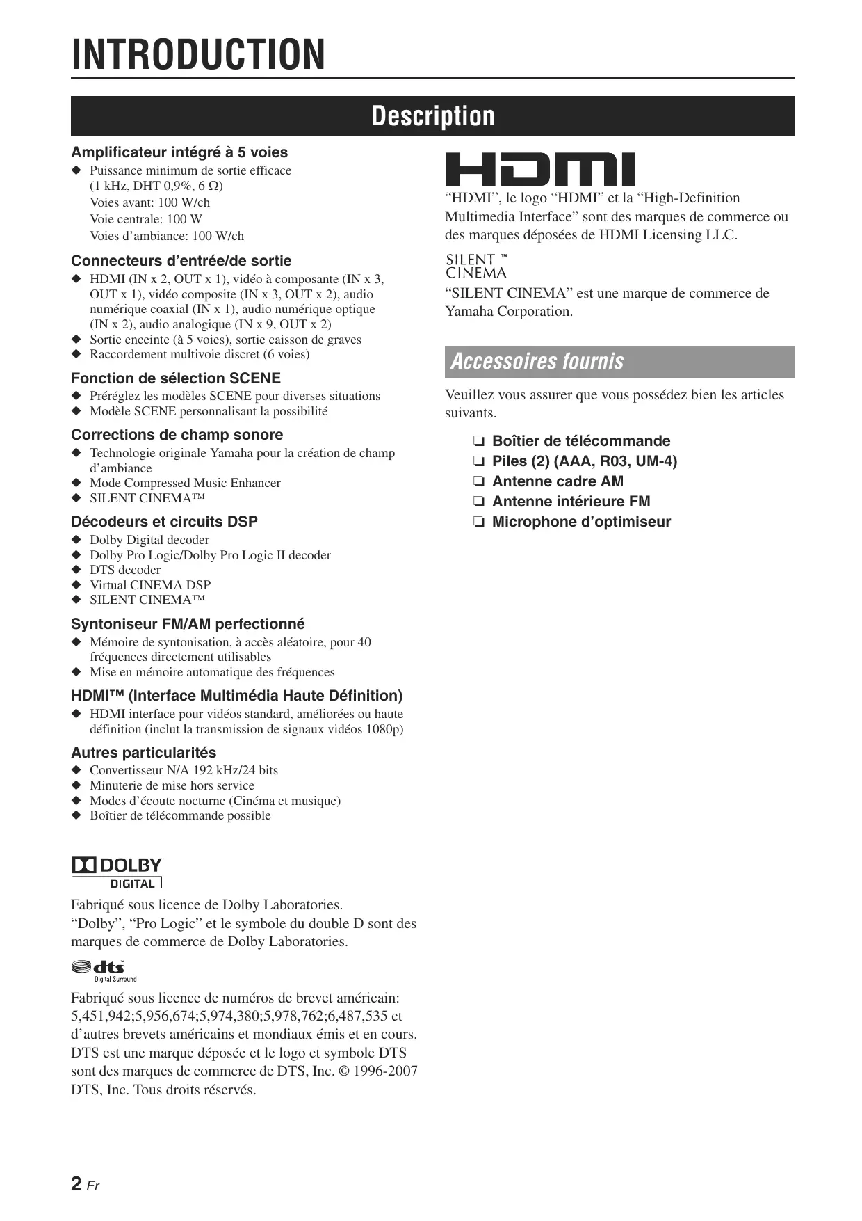 INTRODUCTION Description Amplificateur intégré à 5 voies ◆ Puissance minimum de sortie efficace (1 kHz, DHT 0,9%, 6 :) Voies avant: 100 W/ch Voie centrale: 100 W Voies d’ambiance: 100 W/ch