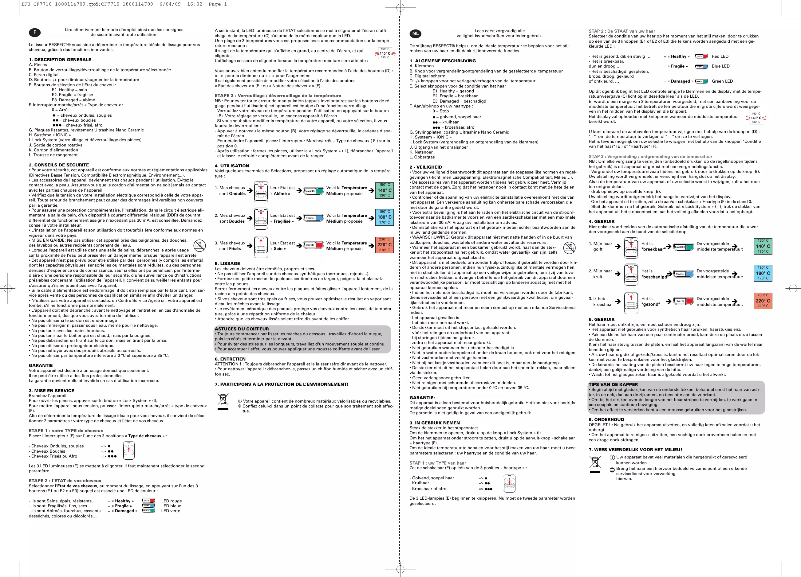 Branchez l’appareil. Pour ouvrir les pinces, appuyez sur le bouton « Lock System » (I). Pour mettre l’appareil sous tension, poussez l’interrupteur marche/arrêt + type de cheveux (F). Afin de déterminer la température de lissage idéale pour vos cheveux, il convient de sélectionner 2 paramètres : votre type de cheveux et l’état de vos cheveux. - Cheveux Ondulés, souples - Cheveux Bouclés - Cheveux Frisés ou Afro Page 1 LED rouge LED bleue LED verte Votre appareil contient de nombreux matériaux valorisables ou recyclables. Confiez celui-ci dans un point de collecte pour que son traitement soit effectué.