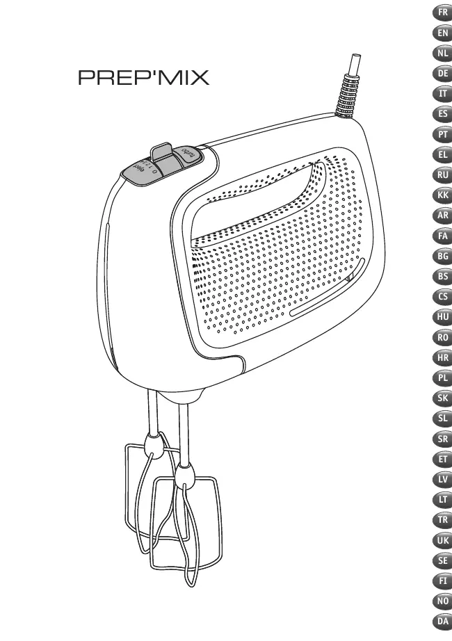 Bonjour et merci d’avoir choisi notre batteur, Prep’Mix ! Vous trouverez, sur cette notice, toutes les informations nécessaires à son utilisation. Nous espérons que vous l’apprécierez ! Attention : un livret de consignes de sécurité est fourni avec cet appareil. Avant d’utiliser votre appareil pour la première fois, lisez attentivement ce livret et conservez-le soigneusement. MISE EN SERVICE • Avant la première utilisation, lavez les fouets (B) et les malaxeurs (D) à l’eau savonneuse. Rincez et séchez. • Vérifiez que le sélecteur de vitesse (A2) est en position « 0 ». • Introduisez les tiges de chaque fouet (B) ou malaxeur (D) dans les orifices prévus à cet effet jusqu’au “clic”. Les fouets et les malaxeurs ont une forme spécifique, le malaxeur ou le fouet avec le détrompeur (C) doit être mis à droite, dans l’orifice le plus gros (Fig.2). • Branchez l’appareil : - Votre appareil est doté de 5 vitesses et d’une touche Turbo. Commencez toujours à mélanger ou pétrir en position 1 avant de passer en position 5. • Après avoir terminé l’opération, positionnez le sélecteur de vitesse (A2) sur la position « 0 ». • Débranchez l’appareil. • Appuyez ensuite sur la touche d’éjection (A1) pour libérer les fouets ou les malaxeurs. RANGEMENT Ne rangez pas votre appareil dans un environnement humide. NETTOYAGE • S’assurer que l’appareil est bien débranché. • Vous pouvez nettoyer les accessoires (B) et (D) à l’eau savonneuse ou au lave-vaisselle, immédiatement après utilisation. • Ne plongez jamais le bloc moteur (A) dans l’eau. Essuyez-le avec un chiffon sec ou à peine humide. SI VOTRE APPAREIL NE FONCTIONNE PAS, QUE FAIRE ? Vérifiez : Le branchement de votre appareil. Le verrouillage de chaque accessoire. La position du bouton variateur (A2) : ramenez le en position « 0 », puis sélectionnez à nouveau la vitesse souhaitée. Votre appareil ne fonctionne toujours pas ? Adressez-vous à un centre agréé (voir liste à la fin de ce livret) ELIMINATION DES MATERIAUX D’EMBALLAGES ET DE L’APPAREIL L’emballage comprend exclusivement des matériaux sans danger pour l’environnement, pouvant être jetés conformément aux dispositions de recyclage en vigueur. Pour la mise au rebut de l’appareil, se renseigner auprès du service approprié de votre commune. Participons à la protection de l’environnement ! Votre appareil contient de nombreux matériaux valorisables ou recyclables. Confiez celui-ci dans un point de collecte pour que son traitement soit effectué.