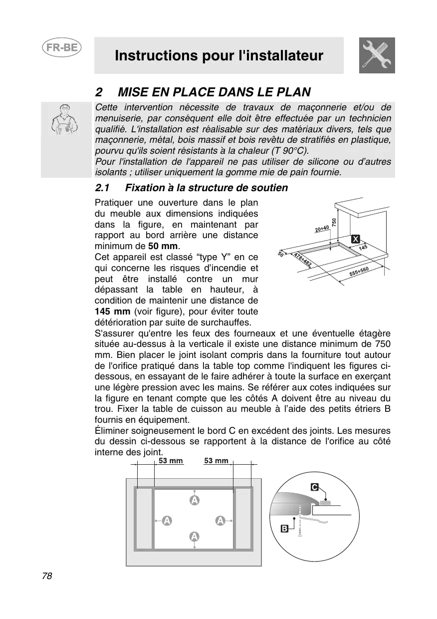Fixation à la structure de soutien Pratiquer une ouverture dans le plan du meuble aux dimensions indiquées dans la figure, en maintenant par rapport au bord arrière une distance minimum de 50 mm. Cet appareil est classé “type Y” en ce qui concerne les risques d’incendie et peut être installé contre un mur dépassant la table en hauteur, à condition de maintenir une distance de 145 mm (voir figure), pour éviter toute détérioration par suite de surchauffes. S'assurer qu'entre les feux des fourneaux et une éventuelle étagère située au-dessus à la verticale il existe une distance minimum de 750 mm. Bien placer le joint isolant compris dans la fourniture tout autour de l'orifice pratiqué dans la table top comme l'indiquent les figures cidessous, en essayant de le faire adhérer à toute la surface en exerçant une légère pression avec les mains. Se référer aux cotes indiquées sur la figure en tenant compte que les côtés A doivent être au niveau du trou. Fixer la table de cuisson au meuble à l’aide des petits étriers B fournis en équipement. Éliminer soigneusement le bord C en excédent des joints. Les mesures du dessin ci-dessous se rapportent à la distance de l'orifice au côté interne des joint.