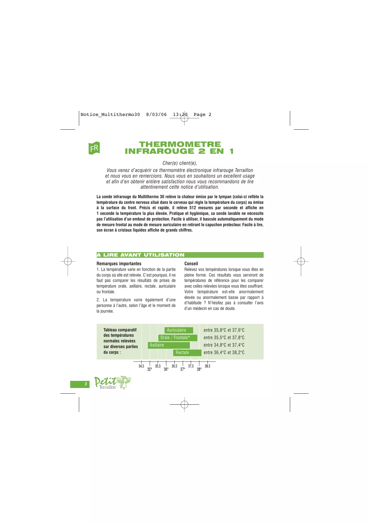 THERMOMETRE INFRAROUGE 2 EN 1 Cher(e) client(e), Vous venez d’acquérir ce thermomètre électronique infrarouge Terraillon et nous vous en remercions. Nous vous en souhaitons un excellent usage et afin d’en obtenir entière satisfaction nous vous recommandons de lire attentivement cette notice d’utilisation. La sonde infrarouge du Multithermo 30 relève la chaleur émise par le tympan (celui-ci reflète la température du centre nerveux situé dans le cerveau qui règle la température du corps) ou émise à la surface du front. Précis et rapide, il relève 512 mesures par seconde et affiche en 1 seconde la température la plus élevée. Pratique et hygiénique, sa sonde lavable ne nécessite pas l’utilisation d’un embout de protection. Facile à utiliser, il bascule automatiquement du mode de mesure frontal au mode de mesure auriculaire en retirant le capuchon protecteur. Facile à lire, son écran à cristaux liquides affiche de grands chiffres.