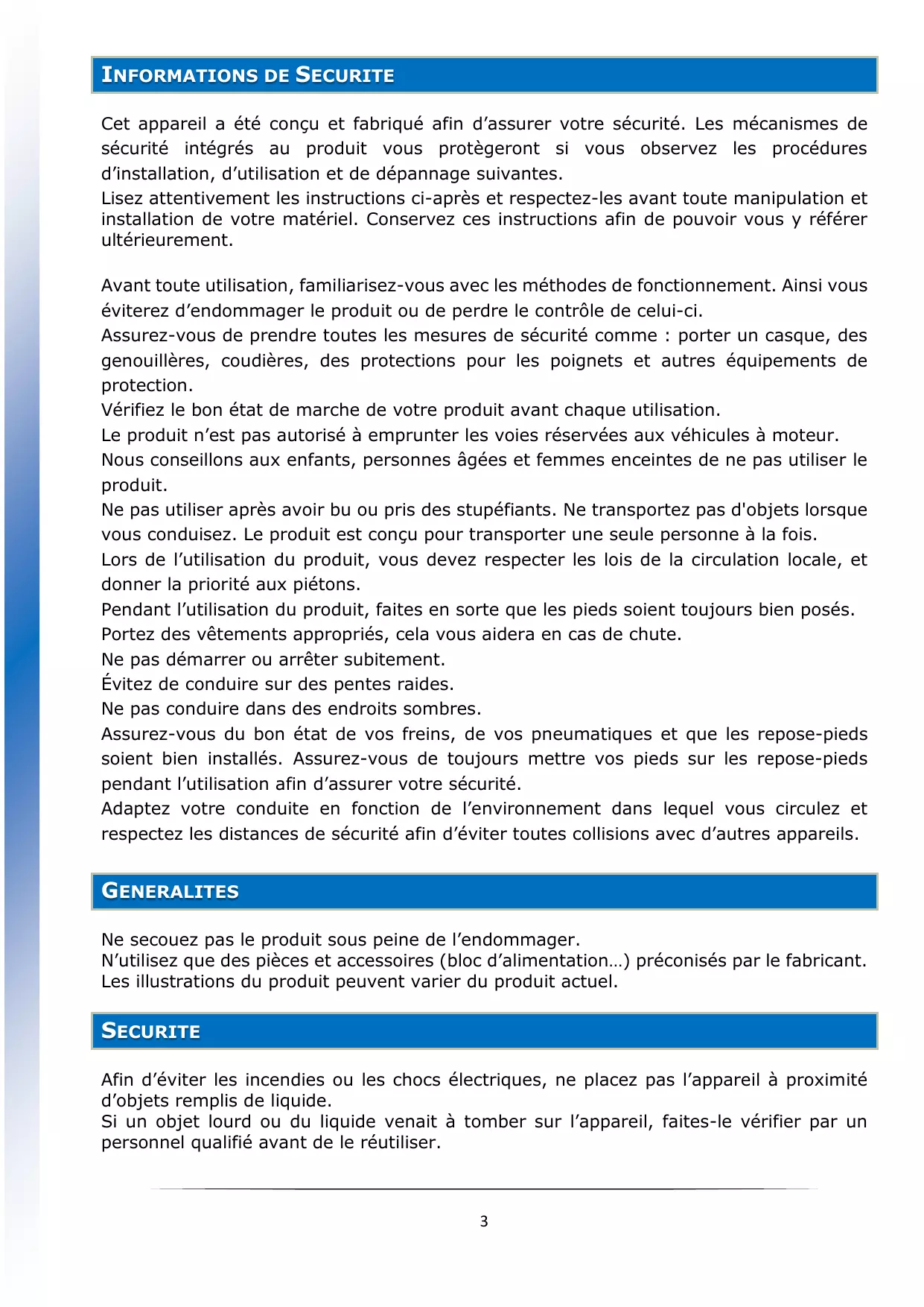 Cet appareil a été conçu et fabriqué afin d’assurer votre sécurité. Les mécanismes de sécurité intégrés au produit vous protègeront si vous observez les procédures d’installation, d’utilisation et de dépannage suivantes. Lisez attentivement les instructions ci-après et respectez-les avant toute manipulation et installation de votre matériel. Conservez ces instructions afin de pouvoir vous y référer ultérieurement. Avant toute utilisation, familiarisez-vous avec les méthodes de fonctionnement. Ainsi vous éviterez d’endommager le produit ou de perdre le contrôle de celui-ci. Assurez-vous de prendre toutes les mesures de sécurité comme : porter un casque, des genouillères, coudières, des protections pour les poignets et autres équipements de protection. Vérifiez le bon état de marche de votre produit avant chaque utilisation. Le produit n’est pas autorisé à emprunter les voies réservées aux véhicules à moteur. Nous conseillons aux enfants, personnes âgées et femmes enceintes de ne pas utiliser le produit. Ne pas utiliser après avoir bu ou pris des stupéfiants. Ne transportez pas d'objets lorsque vous conduisez. Le produit est conçu pour transporter une seule personne à la fois. Lors de l’utilisation du produit, vous devez respecter les lois de la circulation locale, et donner la priorité aux piétons. Pendant l’utilisation du produit, faites en sorte que les pieds soient toujours bien posés. Portez des vêtements appropriés, cela vous aidera en cas de chute. Ne pas démarrer ou arrêter subitement. Évitez de conduire sur des pentes raides. Ne pas conduire dans des endroits sombres. Assurez-vous du bon état de vos freins, de vos pneumatiques et que les repose-pieds soient bien installés. Assurez-vous de toujours mettre vos pieds sur les repose-pieds pendant l’utilisation afin d’assurer votre sécurité. Adaptez votre conduite en fonction de l’environnement dans lequel vous circulez et respectez les distances de sécurité afin d’éviter toutes collisions avec d’autres appareils. GENERALITES Ne secouez pas le produit sous peine de l’endommager. N’utilisez que des pièces et accessoires (bloc d’alimentation…) préconisés par le fabricant. Les illustrations du produit peuvent varier du produit actuel. SECURITE Afin d’éviter les incendies ou les chocs électriques, ne placez pas l’appareil à proximité d’objets remplis de liquide. Si un objet lourd ou du liquide venait à tomber sur l’appareil, faites-le vérifier par un personnel qualifié avant de le réutiliser.