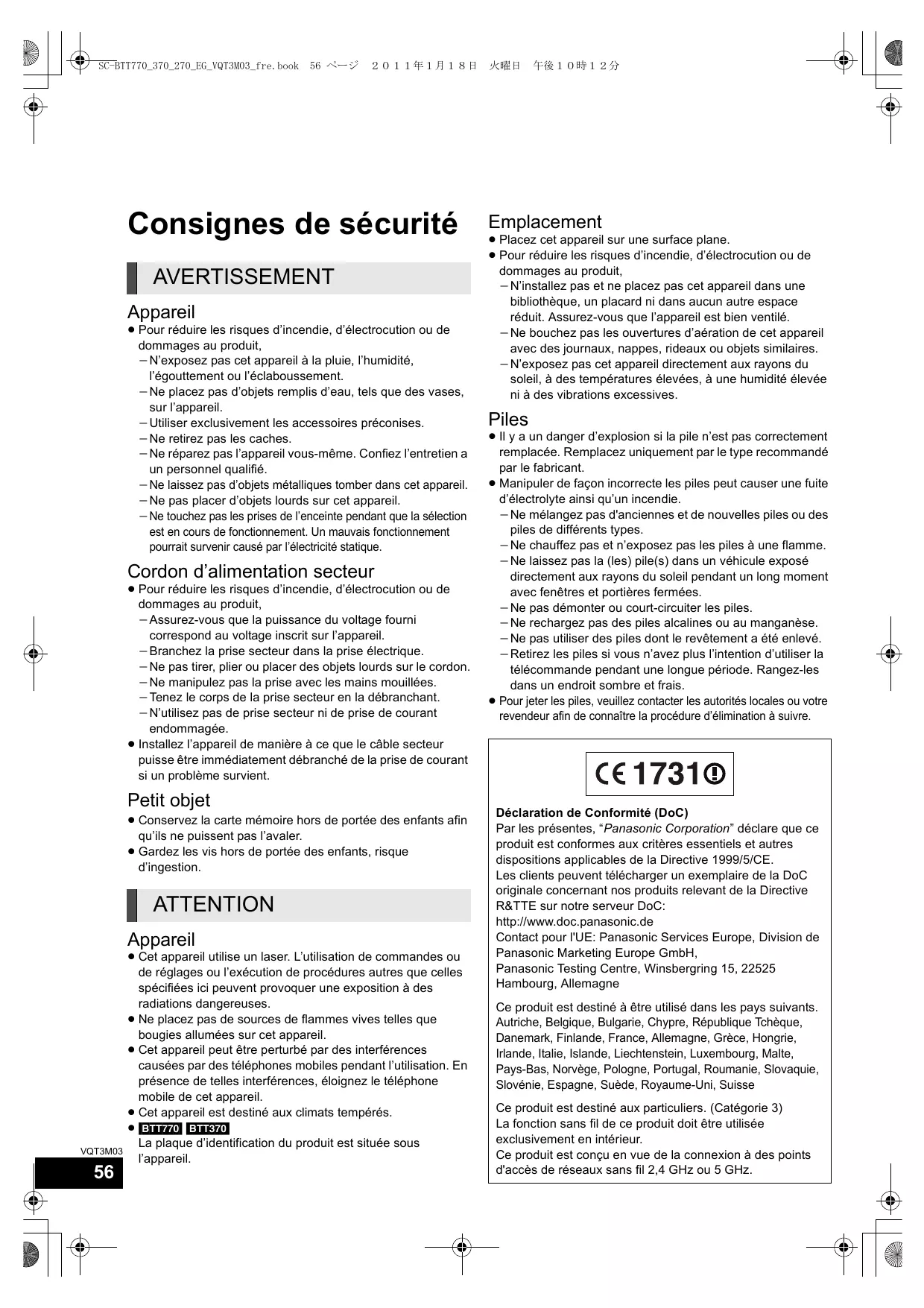 Par les présentes, “Panasonic Corporation” déclare que ce produit est conformes aux critères essentiels et autres dispositions applicables de la Directive 1999/5/CE. Les clients peuvent télécharger un exemplaire de la DoC originale concernant nos produits relevant de la Directive R&TTE sur notre serveur DoC: http://www.doc.panasonic.de Contact pour l'UE: Panasonic Services Europe, Division de Panasonic Marketing Europe GmbH, Panasonic Testing Centre, Winsbergring 15, 22525 Ce produit est conçu en vue de la connexion à des points d'accès de réseaux sans fil 2,4 GHz ou 5 GHz.