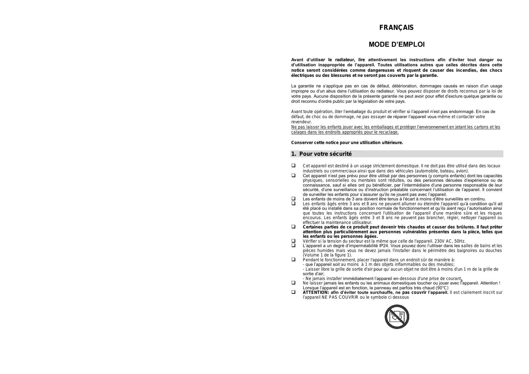 Avant d'utiliser le radiateur, dire attentivement les instructions afin d'éviter tout danger ou d'utilisation inappropriée de l'appareil. Toutes utilisations autres que celles décrites dans cette notice seront considérées comme dangereuses et risquent de causeurs des incendies, des chocs électriques ou des blessures et ne seront pas couverts par la garantie.