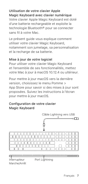 Utilisation de votre clavier Apple Magic Keyboard avec clavier numérique Votre clavier Apple Magic Keyboard est doté d’une batterie rechargeable et exploite la technologie Bluetooth® pour se connecter sans fil à votre Mac. Le présent guide vous explique comment utiliser votre clavier Magic Keyboard, notamment son jumelage, sa personnalisation et la recharge de sa batterie. Mise à jour de votre logiciel Pour utiliser votre clavier Magic Keyboard et l’ensemble de ses fonctionnalités, mettez votre Mac à jour à macOS 10.12.4 ou ultérieur. Pour mettre à jour macOS vers la dernière version, choisissez le menu Pomme > App Store pour savoir si des mises à jour sont proposées. Suivez les instructions à l’écran pour mettre à jour macOS. Configuration de votre clavier Magic Keyboard Câble Lightning vers USB Interrupteur Marche/Arrêt Port Lightning Français