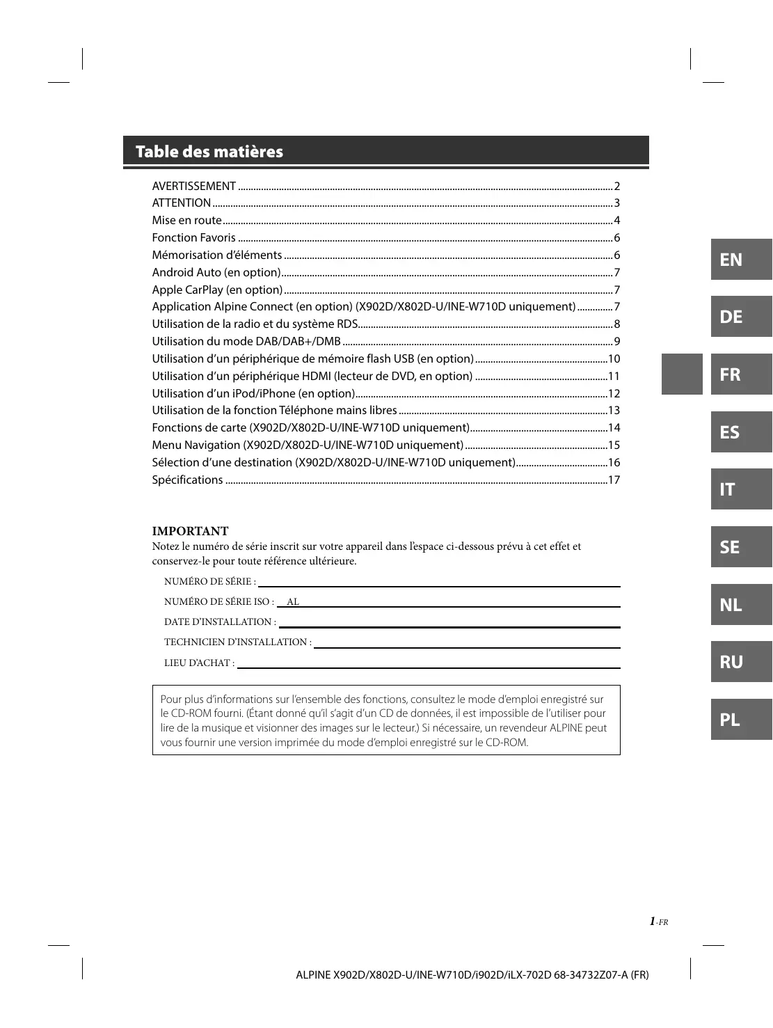 LIEU D’ACHAT : Pour plus d’informations sur l’ensemble des fonctions, consultez le mode d’emploi enregistré sur le CD-ROM fourni. (Étant donné qu’il s’agit d’un CD de données, il est impossible de l’utiliser pour lire de la musique et visionner des images sur le lecteur.) Si nécessaire, un revendeur ALPINE peut vous fournir une version imprimée du mode d’emploi enregistré sur le CD-ROM.