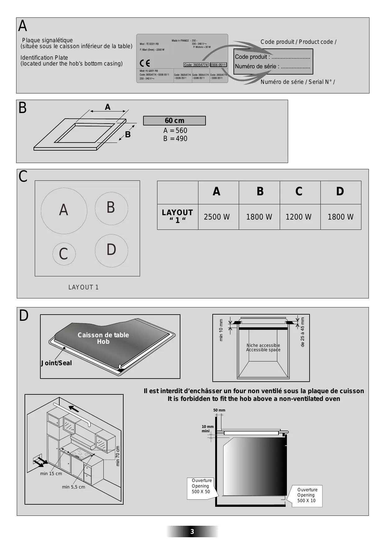 Ouverture Opening 500 X 10 1 • INSTRUCTIONS GENERALES LIRE ATTENTIVEMENT LA NOTICE POUR VOUS PERMETTRE DE TIRER LE MEILLEUR PARTI DE VOTRE APPAREIL. Nous vous conseillons de conserver la notice d'installation et d'utilisation pour toute consultation ultérieure, et de noter, avant installation de la table, le numéro de série de l'appareil en cas d'éventuelle demande d'intervention du service après-vente (Fig. A).