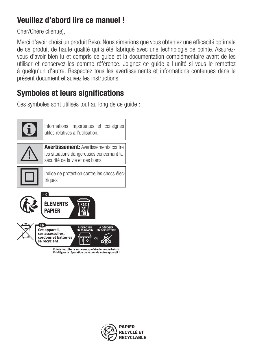19 / EN Veuillez d’abord lire ce manuel ! Cher/Chère client(e), Merci d’avoir choisi un produit Beko. Nous aimerions que vous obteniez une efficacité optimale de ce produit de haute qualité qui a été fabriqué avec une technologie de pointe. Assurezvous d’avoir bien lu et compris ce guide et la documentation complémentaire avant de les utiliser et conservez-les comme référence. Joignez ce guide à l'unité si vous le remettez à quelqu'un d'autre. Respectez tous les avertissements et informations contenues dans le présent document et suivez les instructions.