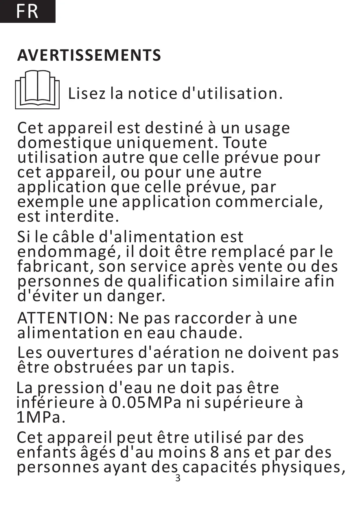 Cet appareil est destiné à un usage domestique uniquement. Toute utilisation autre que celle prévue pour cet appareil, ou pour une autre application que celle prévue, par exemple une application commerciale, est interdite. Si le câble d'alimentation est endommagé, il doit être remplacé par le fabricant, son service après vente ou des personnes de qualification similaire afin d'éviter un danger. ATTENTION: Ne pas raccorder à une alimentation en eau chaude. Les ouvertures d'aération ne doivent pas être obstruées par un tapis. La pression d'eau ne doit pas être inférieure à 0.05MPa ni supérieure à 1MPa. Cet appareil peut être utilisé par des enfants âgés d'au moins 8 ans et par des personnes ayant des3 capacités physiques,