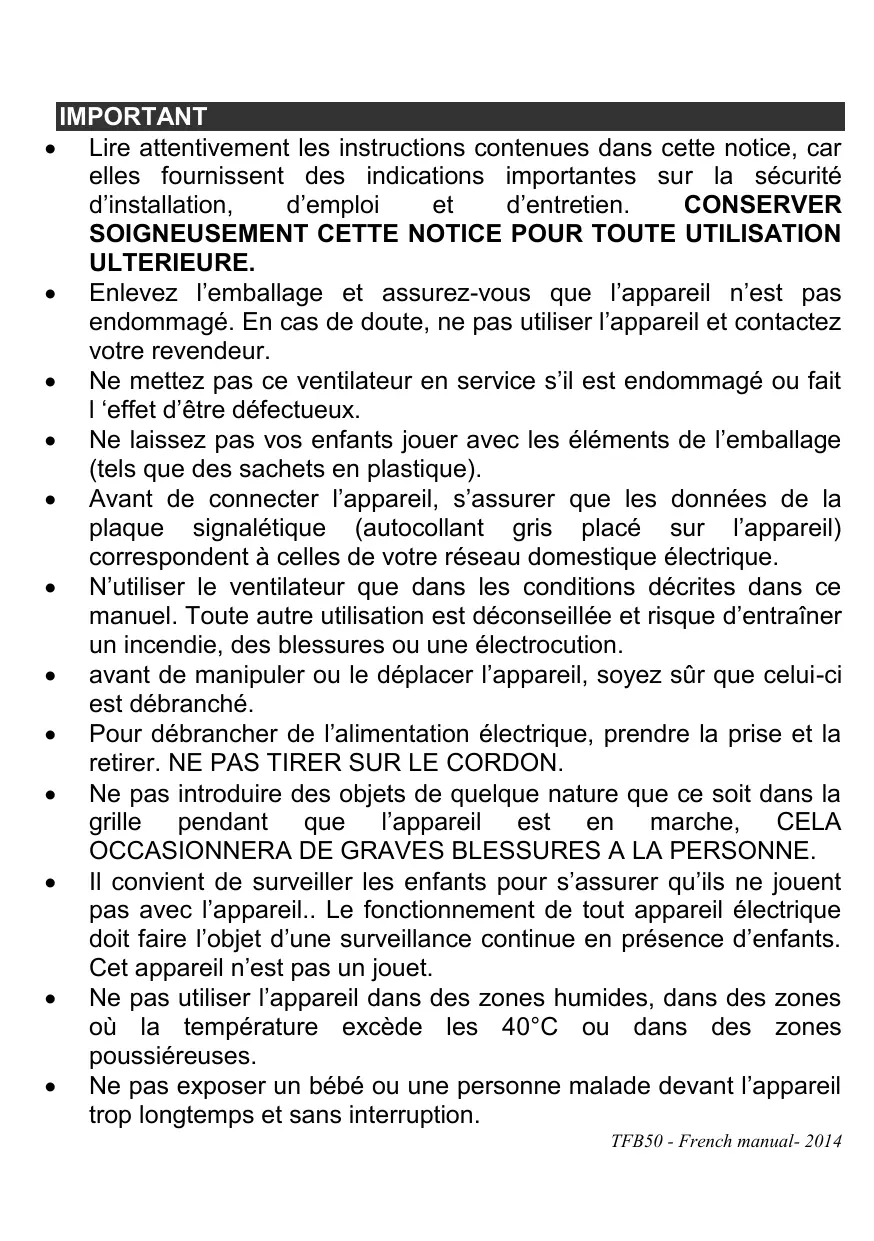 L’utilisation de tout appareil électrique implique l’observation de quelques règles fondamentales:/NE PAS TOUCHER L’APPAREIL AVES DES MAINS OU LES PIEDS HUMIDES OU MOUILLES - NE PAS UTILISER L’APPAREIL EN EXTERIEUR - NE PAS TIRER LE CABLE D’ALIMENTATION OU L’APPAREIL LUI-MEME POUR DEBRANCHER LA FICHE DE LA PRISE DE COURANT. Ne pas utiliser l’appareil à proximité immédiate des baignoires, lavabos, douches, piscines, etc.… Ne pas immerger l’appareil dans l’eau. Pour réduire le risque de feu ou de choc électrique, ne démonter pas l’appareil. Il n’y a aucune raison d’ouvrir cet appareil pour trouver une quelconque pièce utile car il n’en contient pas. Seul le personnel autorisé effectuera le travail de réparation. Cet appareil peut être utilisé par des enfants âgés d'au moins 8 ans et par des personnes ayant des capacités physiques, sensorielles ou mentales réduites ou dénuées d’expérience ou de connaissance, s'ils (si elles) sont correctement surveillé(e)s ou si des instructions relatives à l'utilisation de l'appareil en toute sécurité leur ont été données et si les risques encourus ont été appréhendés. Les enfants ne doivent pas jouer avec l’appareil. Le nettoyage et l'entretien par l'usager ne doivent pas être effectués par des enfants sans surveillance.” Les enfants de moins de 3 ans doivent être tenus à l'écart à moins d’être surveillés en continu. Les enfants âgés entre 3 ans et 8 ans ne peuvent allumer ou éteindre l'appareil qu’à condition qu'il ait été placé ou installé dans sa position normale de fonctionnement et qu’ils aient reçu l’autorisation ainsi que toutes les instructions concernant l'utilisation de l'appareil d'une manière sûre et les risques encourus. Les enfants âgés entre 3 et 8 ans ne peuvent pas brancher, régler, nettoyer l'appareil ou effectuer la maintenance utilisateur. TFB50 - French manual- 2014