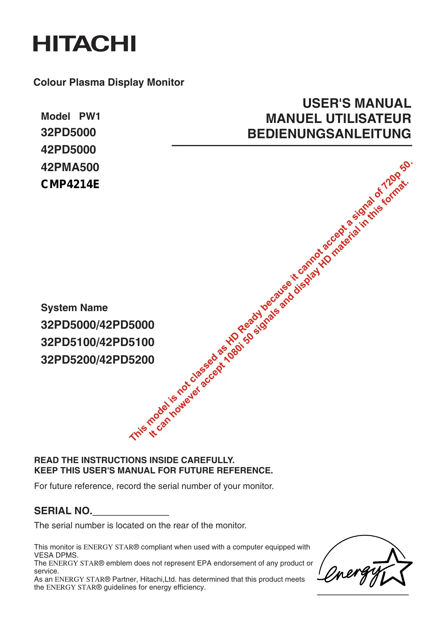 Retrouvez gratuitement la notice de l'appareil 37PD5200 HITACHI au format PDF.