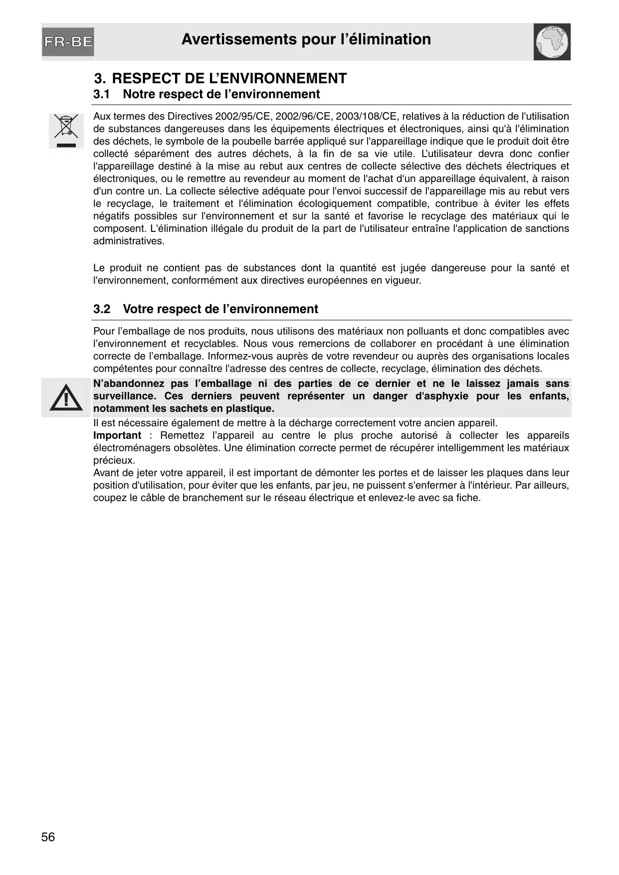 Pour l’emballage de nos produits, nous utilisons des matériaux non polluants et donc compatibles avec l’environnement et recyclables. Nous vous remercions de collaborer en procédant à une élimination correcte de l’emballage. Informez-vous auprès de votre revendeur ou auprès des organisations locales compétentes pour connaître l'adresse des centres de collecte, recyclage, élimination des déchets. N’abandonnez pas l’emballage ni des parties de ce dernier et ne le laissez jamais sans surveillance. Ces derniers peuvent représenter un danger d'asphyxie pour les enfants, notamment les sachets en plastique. Il est nécessaire également de mettre à la décharge correctement votre ancien appareil. Important : Remettez l’appareil au centre le plus proche autorisé à collecter les appareils électroménagers obsolètes. Une élimination correcte permet de récupérer intelligemment les matériaux précieux. Avant de jeter votre appareil, il est important de démonter les portes et de laisser les plaques dans leur position d'utilisation, pour éviter que les enfants, par jeu, ne puissent s'enfermer à l'intérieur. Par ailleurs, coupez le câble de branchement sur le réseau électrique et enlevez-le avec sa fiche.