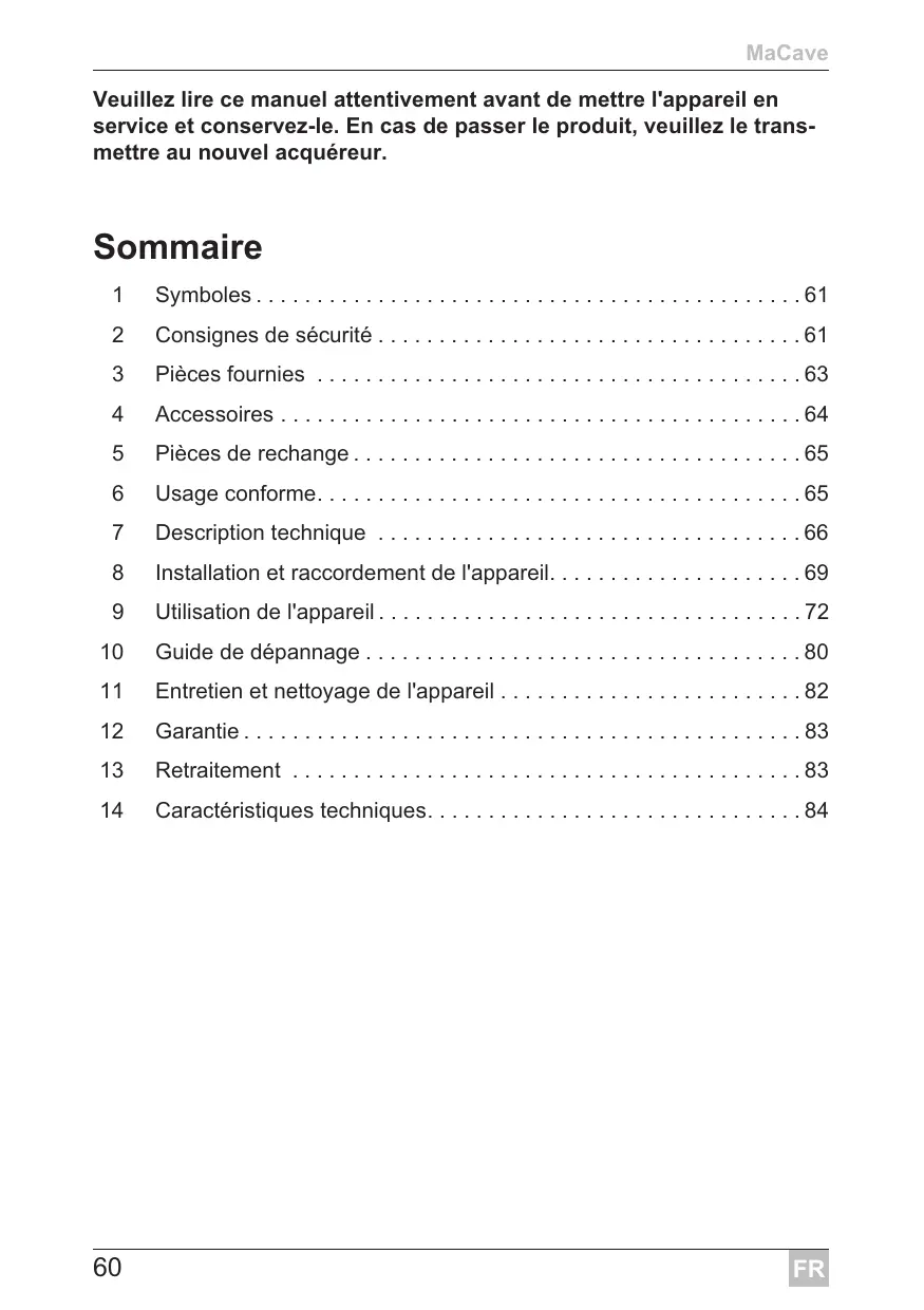 Cave à vin réfrigérée Notice d’utilisation . . . . . . . . . . . . . . 60