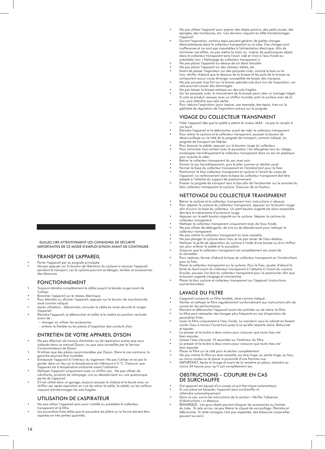 Dyson saranno coperte per 5 anni dalla data d’acquisto, in base alle condizioni previste dalla garanzia.Se avete domande sul vostro apparecchio Dyson, chiamate il Centro Assistenza Dyson tenendo a portata di mano il numero di serie dell’apparecchio e le informazioni su dove e quando è stato acquistato.La maggior parte dei dubbi può essere risolta telefonicamente dallo staff del nostro Centro Assistenza Dyson. Utiliser uniquement de la façon décrite dans ce manuel. N’effectuer aucune maintenance autre que celle décrite dans ce manuel, ou conseillée par le service consommateurs Dyson. UNIQUEMENT adapté à une utilisation dans des endroits secs. Ne pas utiliser à l'extérieur ou sur des surfaces mouillées. Ne manipuler aucune partie de la prise ou de l'appareil avec des mains humides. Ne pas utiliser si la prise ou le cordon est endommagé. Si le cordon d'alimentation est endommagé, il doit être remplacé par Dyson, l'un de ses agents de service ou toute autre personne agréée afin d'éviter tout danger. Si l’appareil Dyson ne fonctionne pas correctement, a reçu un coup intense, est tombé, a été endommagé, laissé dehors ou est tombé dans l’eau, ne pas l’utiliser et contacter le Service Consommateurs de Dyson. Contacter le Service Consommateurs de Dyson en cas de besoin d’un conseil ou d’une réparation. Ne pas démonter l’appareil Dyson car un remontage incorrect pourrait entraîner un choc électrique ou un incendie. Ne pas étirer le câble ou exercer une tension dessus. Garder le câble à l'écart des surfaces chauffées. Ne pas fermer une porte sur le câble ou ne pas tirer sur le câble lorsque celui-ci se trouve à proximité d'angles vifs. Garder le câble à l'écart de la zone de passage, dans un endroit où personne n'est susceptible de marcher ou de trébucher dessus. Ne pas faire rouler l’appareil sur le câble. Ne pas débrancher en tirant sur le cordon d’alimentation. Pour débrancher, saisir la prise et non le cordon. L’utilisation d’une rallonge n’est pas recommandée. Ne pas utiliser pour aspirer de l’eau. Ne pas utiliser pour aspirer des liquides inflammables ou combustibles comme l’essence, ou dans des endroits où un liquide de ce type pourrait être présent. Ne rien aspirer qui brule ou qui fume, comme des cigarettes, des allumettes ou des cendres incandescentes. Éloigner les cheveux, les vêtements amples, les doigts et toute autre partie du corps des ouvertures et des pièces mobiles de l’appareil, notamment la brosse rotative. Ne pas diriger le flexible, le tube ou les accessoires vers les yeux ou les oreilles et ne pas les porter à la bouche. Ne pas placer d’objets dans les ouvertures de l’appareil. Ne pas utiliser l’appareil en cas d’obstruction d’une ouverture. S’assurer que rien ne réduit le flux d’air : poussières, peluches, cheveux ou autres. N’utiliser que les accessoires et pièces de rechange recommandés par Dyson. Pour éviter les risques de chute, enrouler le cordon lorsque l’appareil n’est pas utilisé. Ne pas utiliser sans que le collecteur transparent et le filtre soient en place. Ne pas laisser l'appareil sans surveillance lorsqu'il est branché. Le débrancher lorsqu'il n'est pas utilisé et avant tout entretien. Ne pas tirer ni transporter l'appareil par le câble : le câble n'est pas une poignée. Redoubler de prudence dans les escaliers. Ne pas utiliser l’appareil au-dessus de soi dans les escaliers. Bien éteindre tous les boutons avant de débrancher. Débrancher avant de connecter un autre outil ou accessoire. Toujours dérouler le cordon jusqu’à la ligne rouge, mais ne jamais l’étirer ou tirer dessus. Tenir la fiche dans la main lors de l’enroulement du cordon. Ne pas laisser la fiche fouetter l’air lors de l’enroulement du cordon.
