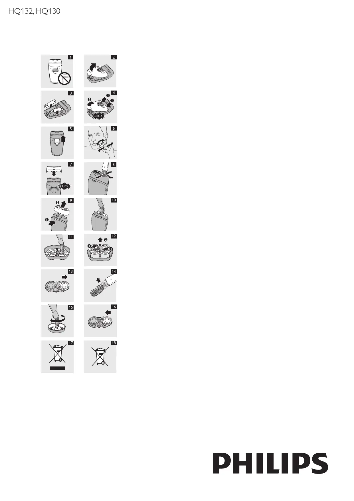 8 Remettez l’unité de rasage sur le rasoir. Nettoyage en profondeur Pour un nettoyage en profondeur des têtes de rasoir, vous pouvez utiliser un liquide dégraissant (par exemple de l’alcool) tous les six mois. Suivez les étapes 1 à 4 décrites ci-dessus pour démonter les têtes de rasoir. N’oubliez pas de lubrifier le point central des grilles avec une goutte d’huile pour machine à coudre après le nettoyage afin d’éviter toute usure. Remplacement Remplacez les têtes de rasoir tous les 2 ans ou avant si elles sont endommagées ou usées. Remplacez-les uniquement par des têtes de rasoir PhilipsÇHQ4. 1 Éteignez le rasoir. 2 Appuyez sur le bouton de déverrouillage (1) et retirez l’unité de rasage (2) (fig. 9). 3 Appuyez de chaque côté du ressort central pour le resserrer (1), puis retirez le système de fixation de l’unité de rasage (2) (fig. 12). 4 Retirez les têtes de rasoir de l’unité de fixation et remplacez-les par de nouvelles têtes (fig. 13). 5 Replacez le système de fixation sur l’unité de rasage. 6 Remettez l’unité de rasage sur le rasoir. Accessoires Les accessoires suivants sont disponibles : -- Têtes de rasoir PhilipsÇHQ4. -- Spray Philips Shaving Head Cleaner HQ110 (non disponible en Chine) Environnement -- Les piles contiennent des substances qui peuvent nuire à l’environnement. Ne jetez pas les piles usées avec les ordures ménagères, mais déposez-les à un endroit assigné à cet effet. Retirez toujours les piles avant de mettre l’appareil au rebut et de le déposer à un endroit assigné à cet effet. -- Lorsqu’il ne fonctionnera plus, ne jetez pas l’appareil avec les ordures ménagères, mais déposez-le à un endroit assigné à cet effet, où il pourra être recyclé. Vous contribuerez ainsi à la protection de l’environnement (fig. 17). Garantie et service Si vous souhaitez obtenir des informations supplémentaires ou faire réparer l’appareil, ou si vous rencontrez un problème, rendez-vous sur le site Web de Philips à l’adresse www.philips.com ou contactez le Service Consommateurs Philips de votre pays (vous trouverez le numéro de téléphone correspondant sur le dépliant de garantie internationale). S’il n’existe pas de Service Consommateurs Philips dans votre pays, renseignez-vous auprès de votre revendeur Philips local. Limites de la garantie Étant susceptibles de s’user, les têtes de rasoir (lames et grilles) ne sont pas couvertes par la garantie internationale. Dépannage Ce chapitre présente les problèmes les plus courants que vous pouvez rencontrer avec votre appareil. Si vous ne parvenez pas à résoudre le problème à l’aide des informations ci-dessous, contactez le Service Consommateurs Philips de votre pays.