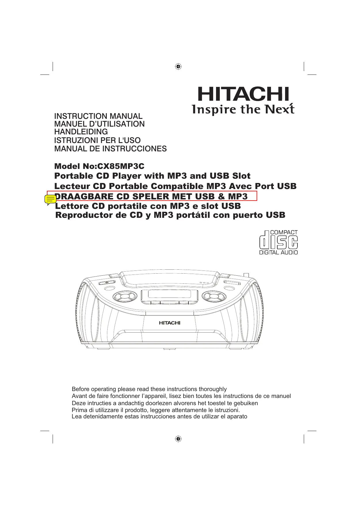 Téléchargez la notice de votre Lecteur CD portable au format PDF gratuitement ! Retrouvez votre notice CX85MP3C - HITACHI et reprennez votre appareil électronique en main. Sur cette page sont publiés tous les documents nécessaires à l'utilisation de votre appareil CX85MP3C de la marque HITACHI.