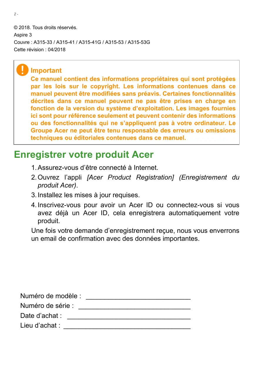 A315-53G-58KWI341 - Ordinateur portable ACER - Notice d'utilisation et mode d'emploi gratuit