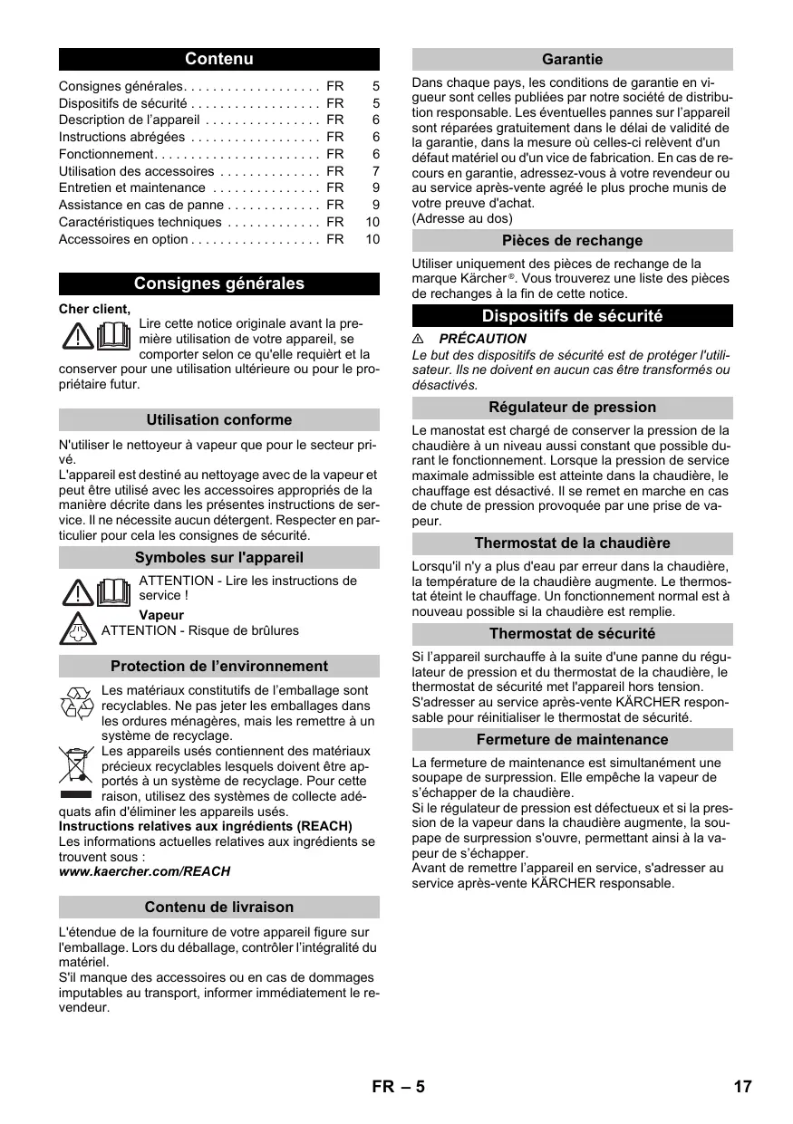 Dans chaque pays, les conditions de garantie en vigueur sont celles publiées par notre société de distribution responsable. Les éventuelles pannes sur l’appareil sont réparées gratuitement dans le délai de validité de la garantie, dans la mesure où celles-ci relèvent d'un défaut matériel ou d'un vice de fabrication. En cas de recours en garantie, adressez-vous à votre revendeur ou au service après-vente agréé le plus proche munis de votre preuve d'achat. (Adresse au dos) Pièces de rechange Utiliser uniquement des pièces de rechange de la marque Kärcher ®. Vous trouverez une liste des pièces de rechanges à la fin de cette notice. Consignes générales Cher client, Lire cette notice originale avant la première utilisation de votre appareil, se comporter selon ce qu'elle requièrt et la conserver pour une utilisation ultérieure ou pour le propriétaire futur. Dispositifs de sécurité 몇 PRÉCAUTION Le but des dispositifs de sécurité est de protéger l'utilisateur. Ils ne doivent en aucun cas être transformés ou désactivés. Régulateur de pression Utilisation conforme N'utiliser le nettoyeur à vapeur que pour le secteur privé. L'appareil est destiné au nettoyage avec de la vapeur et peut être utilisé avec les accessoires appropriés de la manière décrite dans les présentes instructions de service. Il ne nécessite aucun détergent. Respecter en particulier pour cela les consignes de sécurité. Symboles sur l'appareil Le manostat est chargé de conserver la pression de la chaudière à un niveau aussi constant que possible durant le fonctionnement. Lorsque la pression de service maximale admissible est atteinte dans la chaudière, le chauffage est désactivé. Il se remet en marche en cas de chute de pression provoquée par une prise de vapeur. Thermostat de la chaudière Lorsqu'il n'y a plus d'eau par erreur dans la chaudière, la température de la chaudière augmente. Le thermostat éteint le chauffage. Un fonctionnement normal est à nouveau possible si la chaudière est remplie. ATTENTION - Lire les instructions de service ! Vapeur ATTENTION - Risque de brûlures Thermostat de sécurité Protection de l’environnement Les matériaux constitutifs de l’emballage sont recyclables. Ne pas jeter les emballages dans les ordures ménagères, mais les remettre à un système de recyclage. Les appareils usés contiennent des matériaux précieux recyclables lesquels doivent être apportés à un système de recyclage. Pour cette raison, utilisez des systèmes de collecte adéquats afin d'éliminer les appareils usés. Instructions relatives aux ingrédients (REACH) Les informations actuelles relatives aux ingrédients se trouvent sous : www.kaercher.com/REACH Si l’appareil surchauffe à la suite d'une panne du régulateur de pression et du thermostat de la chaudière, le thermostat de sécurité met l'appareil hors tension. S'adresser au service après-vente KÄRCHER responsable pour réinitialiser le thermostat de sécurité. Fermeture de maintenance La fermeture de maintenance est simultanément une soupape de surpression. Elle empêche la vapeur de s’échapper de la chaudière. Si le régulateur de pression est défectueux et si la pression de la vapeur dans la chaudière augmente, la soupape de surpression s'ouvre, permettant ainsi à la vapeur de s’échapper. Avant de remettre l’appareil en service, s'adresser au service après-vente KÄRCHER responsable. Contenu de livraison L'étendue de la fourniture de votre appareil figure sur l'emballage. Lors du déballage, contrôler l’intégralité du matériel. S'il manque des accessoires ou en cas de dommages imputables au transport, informer immédiatement le revendeur. FR – 5