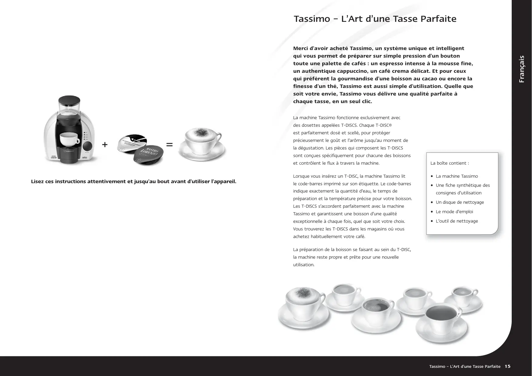 La boîte contient : • La machine Tassimo • Une fiche synthétique des consignes d’utilisation • Un disque de nettoyage • Le mode d’emploi • L’outil de nettoyage
