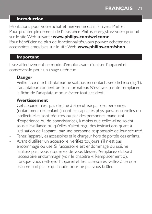 Français 71 Introduction Félicitations pour votre achat et bienvenue dans l’univers Philips ! Pour profiter pleinement de l’assistance Philips, enregistrez votre produit sur le site Web suivant : www.philips.com/welcome. Pour bénéficier de plus de fonctionnalités, vous pouvez acheter des accessoires amovibles sur le site Web www.philips.com/shop. Important Lisez attentivement ce mode d’emploi avant d’utiliser l’appareil et conservez-le pour un usage ultérieur. Danger -- Veillez à ce que l’adaptateur ne soit pas en contact avec de l’eau (fig. 1). -- L’adaptateur contient un transformateur. N’essayez pas de remplacer la fiche de l’adaptateur pour éviter tout accident. Avertissement -- Cet appareil n’est pas destiné à être utilisé par des personnes (notamment des enfants) dont les capacités physiques, sensorielles ou intellectuelles sont réduites, ou par des personnes manquant d’expérience ou de connaissances, à moins que celles-ci ne soient sous surveillance ou qu’elles n’aient reçu des instructions quant à l’utilisation de l’appareil par une personne responsable de leur sécurité. -- Tenez l’appareil, les accessoires et le chargeur hors de portée des enfants. -- Avant d’utiliser un accessoire, vérifiez toujours s’il n’est pas endommagé ou usé. Si l’accessoire est endommagé ou usé, ne l’utilisez pas : vous risqueriez de vous blesser. Remplacez d’abord l’accessoire endommagé (voir le chapitre « Remplacement »). -- Lorsque vous nettoyez l’appareil et les accessoires, veillez à ce que l’eau ne soit pas trop chaude pour ne pas vous brûler.