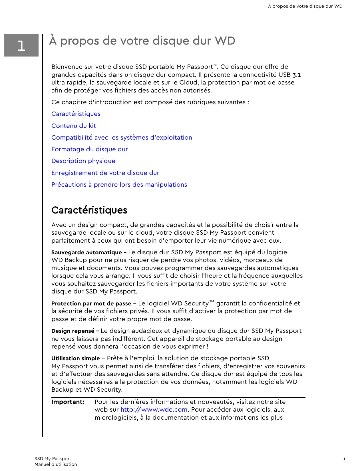 À propos de votre disque dur WD Bienvenue sur votre disque SSD portable My Passport™. Ce disque dur offre de grandes capacités dans un disque dur compact. Il présente la connectivité USB 3.1 ultra rapide, la sauvegarde locale et sur le Cloud, la protection par mot de passe afin de protéger vos fichiers des accès non autorisés. Ce chapitre d'introduction est composé des rubriques suivantes : Caractéristiques Contenu du kit Compatibilité avec les systèmes d'exploitation Formatage du disque dur Description physique Enregistrement de votre disque dur Précautions à prendre lors des manipulations Caractéristiques Avec un design compact, de grandes capacités et la possibilité de choisir entre la sauvegarde locale ou sur le cloud, votre disque SSD My Passport convient parfaitement à ceux qui ont besoin d'emporter leur vie numérique avec eux. Sauvegarde automatique – Le disque dur SSD My Passport est équipé du logiciel WD Backup pour ne plus risquer de perdre vos photos, vidéos, morceaux de musique et documents. Vous pouvez programmer des sauvegardes automatiques lorsque cela vous arrange. Il vous suffit de choisir l'heure et la fréquence auxquelles vous souhaitez sauvegarder les fichiers importants de votre système sur votre disque dur SSD My Passport. Protection par mot de passe – Le logiciel WD Security™ garantit la confidentialité et la sécurité de vos fichiers privés. Il vous suffit d'activer la protection par mot de passe et de définir votre propre mot de passe. Design repensé – Le design audacieux et dynamique du disque dur SSD My Passport ne vous laissera pas indifférent. Cet appareil de stockage portable au design repensé vous donnera l'occasion de vous exprimer ! Utilisation simple – Prête à l'emploi, la solution de stockage portable SSD My Passport vous permet ainsi de transférer des fichiers, d'enregistrer vos souvenirs et d'effectuer des sauvegardes sans attendre. Ce disque dur est équipé de tous les logiciels nécessaires à la protection de vos données, notamment les logiciels WD Backup et WD Security. Important: SSD My Passport Manuel d’utilisation Pour les dernières informations et nouveautés, visitez notre site web sur http://www.wdc.com. Pour accéder aux logiciels, aux micrologiciels, à la documentation et aux informations les plus