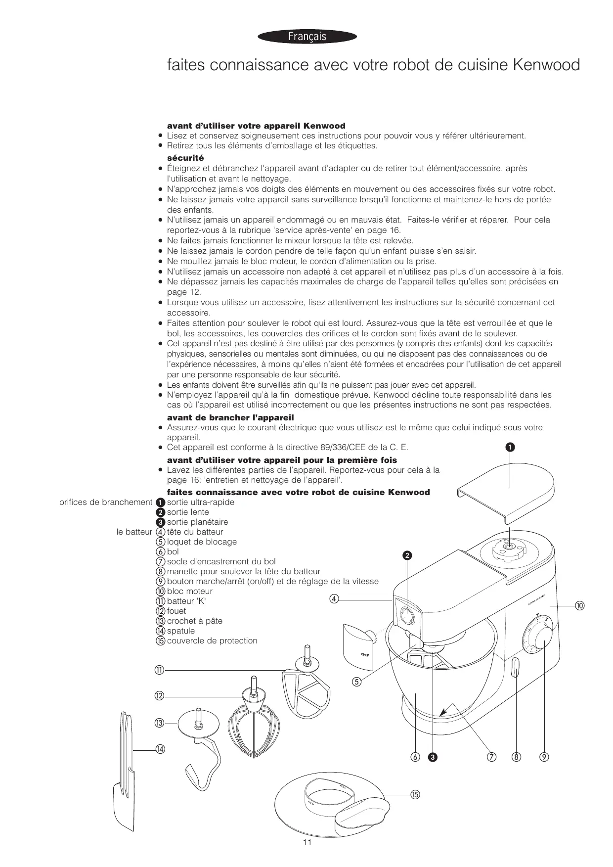 avant d’utiliser votre appareil Kenwood Lisez et conservez soigneusement ces instructions pour pouvoir vous y référer ultérieurement. Retirez tous les éléments d’emballage et les étiquettes. sécurité Éteignez et débranchez l'appareil avant d'adapter ou de retirer tout élément/accessoire, après l'utilisation et avant le nettoyage. N’approchez jamais vos doigts des éléments en mouvement ou des accessoires fixés sur votre robot. Ne laissez jamais votre appareil sans surveillance lorsqu’il fonctionne et maintenez-le hors de portée des enfants. N’utilisez jamais un appareil endommagé ou en mauvais état. Faites-le vérifier et réparer. Pour cela reportez-vous à la rubrique 'service après-vente' en page 16. Ne faites jamais fonctionner le mixeur lorsque la tête est relevée. Ne laissez jamais le cordon pendre de telle façon qu’un enfant puisse s’en saisir. Ne mouillez jamais le bloc moteur, le cordon d’alimentation ou la prise. N’utilisez jamais un accessoire non adapté à cet appareil et n’utilisez pas plus d’un accessoire à la fois. Ne dépassez jamais les capacités maximales de charge de l’appareil telles qu’elles sont précisées en page 12. Lorsque vous utilisez un accessoire, lisez attentivement les instructions sur la sécurité concernant cet accessoire. Faites attention pour soulever le robot qui est lourd. Assurez-vous que la tête est verrouillée et que le bol, les accessoires, les couvercles des orifices et le cordon sont fixés avant de le soulever. Cet appareil n’est pas destiné à être utilisé par des personnes (y compris des enfants) dont les capacités physiques, sensorielles ou mentales sont diminuées, ou qui ne disposent pas des connaissances ou de l’expérience nécessaires, à moins qu’elles n’aient été formées et encadrées pour l’utilisation de cet appareil par une personne responsable de leur sécurité. Les enfants doivent être surveillés afin qu'ils ne puissent pas jouer avec cet appareil. N’employez l’appareil qu’à la fin domestique prévue. Kenwood décline toute responsabilité dans les cas où l’appareil est utilisé incorrectement ou que les présentes instructions ne sont pas respectées. avant de brancher l’appareil Assurez-vous que le courant électrique que vous utilisez est le même que celui indiqué sous votre appareil. Cet appareil est conforme à la directive 89/336/CEE de la C. E. avant d’utiliser votre appareil pour la première fois Lavez les différentes parties de l’appareil. Reportez-vous pour cela à la page 16: 'entretien et nettoyage de l’appareil'. faites connaissance avec votre robot de cuisine Kenwood orifices de branchement sortie ultra-rapide sortie lente sortie planétaire le batteur tête du batteur loquet de blocage bol socle d'encastrement du bol manette pour soulever la tête du batteur bouton marche/arrêt (on/off) et de réglage de la vitesse bloc moteur batteur 'K' fouet crochet à pâte spatule couvercle de protection