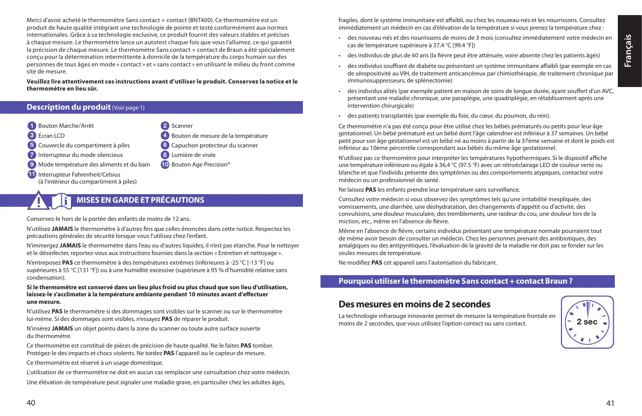 Français Merci d'avoir acheté le thermomètre Sans contact + contact (BNT400). Ce thermomètre est un produit de haute qualité intégrant une technologie de pointe et testé conformément aux normes internationales. Grâce à sa technologie exclusive, ce produit fournit des valeurs stables et précises à chaque mesure. Le thermomètre lance un autotest chaque fois que vous l’allumez, ce qui garantit la précision de chaque mesure. Le thermomètre Sans contact + contact de Braun a été spécialement conçu pour la détermination intermittente à domicile de la température du corps humain sur des personnes de tous âges en mode « contact » et « sans contact » en utilisant le milieu du front comme site de mesure. Conseils pour la mesure de la température Grâce à sa technologie brevetée exclusive, le thermomètre « Sans contact + contact » capte la chaleur naturellement émise par le front et calcule la température corporelle. Profitez toujours de la même précision professionnelle, que vous touchiez le front de votre enfant ou que vous teniez le thermomètre jusqu'à 2,5 cm de distance. Il est important de connaître la température normale d’une personne en bonne santé. Cela est impératif pour pouvoir diagnostiquer une fièvre avec certitude. Effectuez plusieurs mesures sur la personne en bonne santé afin de déterminer sa température normale. Facile à utiliser La température normale d’un enfant peut être comprise entre 36,1 °C (97,0 °F) et 37,7 °C (99,9 °F). Gardez à l’esprit que cet appareil donne des mesures inférieures de 0,5 °C (0.9 °F) à une mesure par thermomètre numérique rectal. Le thermomètre « Sans contact + contact » est non invasif. Vous pouvez mesurer la température même sur un enfant endormi. Avant toute mesure, la personne concernée doit se trouver à l'intérieur depuis au moins 30 minutes. Le thermomètre « Sans contact + contact » est plus sûr qu’un thermomètre rectal chez l'enfant, et plus facile à utiliser que d’autres méthodes. Remarque : Le thermomètre et l'individu doivent être exposés à la même température ambiante pendant au moins 10 minutes. Sûr et hygiénique VEILLEZ TOUJOURS à ce que le thermomètre et le front restent stables pendant la mesure. NE bougez pas le thermomètre avant d'entendre le bip final. N'EFFECTUEZ aucune mesure pendant que vous allaitez un nourrisson, ni immédiatement après. L’option sans contact contribue à minimiser la propagation des microbes. Son usage est entièrement sûr, aussi bien chez l’enfant que chez l’adulte. Les individus ne doivent ni boire, ni manger, ni pratiquer la moindre activité physique avant et pendant la mesure. Avant toute mesure, retirez les éventuels couvre-chefs et patientez 10 minutes. Comment le thermomètre Sans contact + contact Braun fonctionne-t-il ? Avant d’effectuer une mesure, éliminez toute saleté ou tout cheveu du front. Après le nettoyage, patientez 10 minutes avant d’effectuer la mesure. Le thermomètre « Sans contact + contact » mesure l’énergie infrarouge émise par la peau au centre du front. Cette énergie captée est recueillie par la lentille et convertie en une valeur de température buccale équivalente. Le thermomètre « Sans contact + contact » a été testé cliniquement. Sa sécurité et sa précision ont été établies pour des utilisations conformes à cette notice. PRENEZ TOUJOURS la température en suivant scrupuleusement les instructions. Les valeurs de température pourraient varier si le dispositif est mal positionné. Nous recommandons aux individus prenant leur propre température d'utiliser l'option contact plutôt que l'option sans contact. Dans les cas suivants, il est recommandé d’effectuer au moins trois mesures de température au même endroit et de conserver la plus élevée : Écran à code couleur Age Precision®