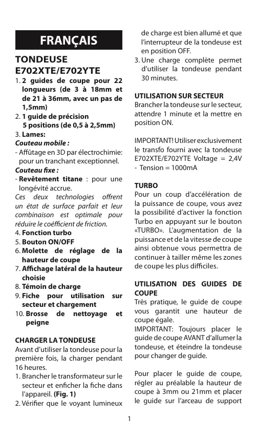 Brancher la tondeuse sur le secteur, attendre 1 minute et la mettre en position ON. IMPORTANT! Utiliser exclusivement le transfo fourni avec la tondeuse E702XTE/E702YTE Voltage = 2,4V - Tension = 1000mA TURBO Pour un coup d’accélération de la puissance de coupe, vous avez la possibilité d’activer la fonction Turbo en appuyant sur le bouton «TURBO». L’augmentation de la puissance et de la vitesse de coupe ainsi obtenue vous permettra de continuer à tailler même les zones de coupe les plus difficiles.