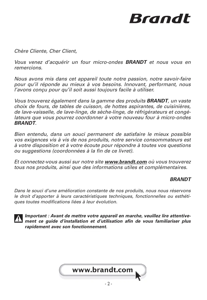Chère Cliente, Cher Client, Vous venez d’acquérir un four micro-ondes BRANDT et nous vous en remercions. Nous avons mis dans cet appareil toute notre passion, notre savoir-faire pour qu’il réponde au mieux à vos besoins. Innovant, performant, nous l’avons conçu pour qu’il soit aussi toujours facile à utiliser. Vous trouverez également dans la gamme des produits BRANDT, un vaste choix de fours, de tables de cuisson, de hottes aspirantes, de cuisinières, de lave-vaisselle, de lave-linge, de sèche-linge, de réfrigérateurs et congélateurs que vous pourrez coordonner à votre nouveau four à micro-ondes BRANDT. Bien entendu, dans un souci permanent de satisfaire le mieux possible vos exigences vis à vis de nos produits, notre service consommateurs est à votre disposition et à votre écoute pour répondre à toutes vos questions ou suggestions (coordonnées à la fin de ce livret). Et connectez-vous aussi sur notre site www.brandt.com où vous trouverez tous nos produits, ainsi que des informations utiles et complémentaires. BRANDT Dans le souci d’une amélioration constante de nos produits, nous nous réservons le droit d’apporter à leurs caractéristiques techniques, fonctionnelles ou esthétiques toutes modifications liées à leur évolution. Important : Avant de mettre votre appareil en marche, veuillez lire attentivement ce guide d’installation et d’utilisation afin de vous familiariser plus rapidement avec son fonctionnement.