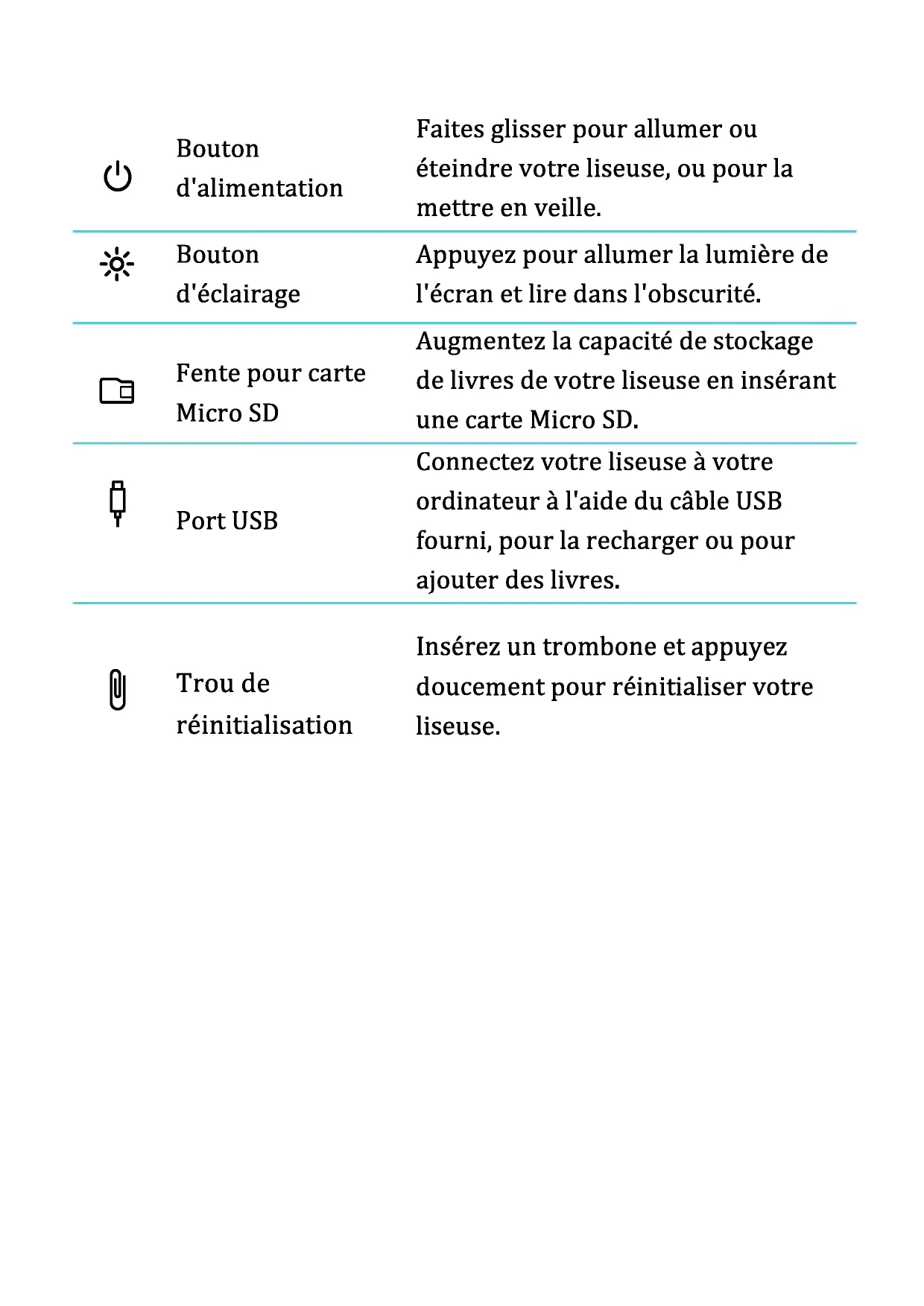 Bouton d'alimentation Faites glisser pour allumer ou éteindre votre liseuse, ou pour la mettre en veille. Bouton d'éclairage Appuyez pour allumer la lumière de l'écran et lire dans l'obscurité. Fente pour carte Micro SD Augmentez la capacité de stockage de livres de votre liseuse en insérant une carte Micro SD. Port USB Connectez votre liseuse à votre ordinateur à l'aide du câble USB fourni, pour la recharger ou pour ajouter des livres. Insérez un trombone et appuyez Trou de réinitialisation doucement pour réinitialiser votre liseuse. Recharger votre liseuse Pour recharger votre liseuse, connectez-la à votre ordinateur en utilisant le câble USB fourni. t =--