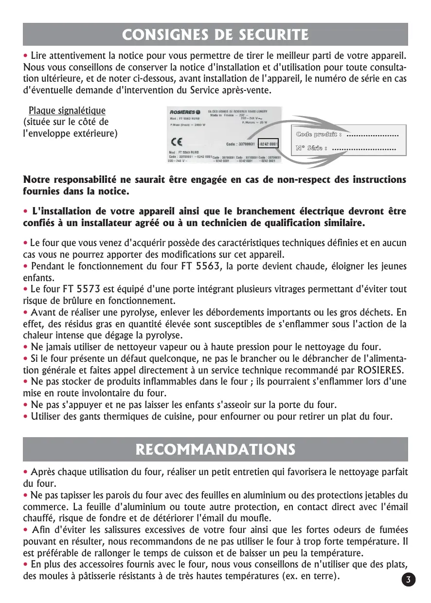 Lire attentivement la notice pour vous permettre de tirer le meilleur parti de votre appareil. Nous vous conseillons de conserver la notice d'installation et d'utilisation pour toute consultation ultérieure, et de noter ci-dessous, avant installation de l'appareil, le numéro de série en cas d'éventuelle demande d'intervention du Service après-vente. Plaque signalétique (située sur le côté de l'enveloppe extérieure) Notre responsabilité ne saurait être engagée en cas de non-respect des instructions fournies dans la notice. L'installation de votre appareil ainsi que le branchement électrique devront être confiés à un installateur agréé ou à un technicien de qualification similaire. Le four que vous venez d'acquérir possède des caractéristiques techniques définies et en aucun cas vous ne pourrez apporter des modifications sur cet appareil. Pendant le fonctionnement du four FT 5563, la porte devient chaude, éloigner les jeunes enfants. Le four FT 5573 est équipé d'une porte intégrant plusieurs vitrages permettant d'éviter tout risque de brûlure en fonctionnement. Avant de réaliser une pyrolyse, enlever les débordements importants ou les gros déchets. En effet, des résidus gras en quantité élevée sont susceptibles de s'enflammer sous l'action de la chaleur intense que dégage la pyrolyse. Ne jamais utiliser de nettoyeur vapeur ou à haute pression pour le nettoyage du four. Si le four présente un défaut quelconque, ne pas le brancher ou le débrancher de l'alimentation générale et faites appel directement à un service technique recommandé par ROSIERES. Ne pas stocker de produits inflammables dans le four ; ils pourraient s'enflammer lors d'une mise en route involontaire du four. Ne pas s'appuyer et ne pas laisser les enfants s'asseoir sur la porte du four. Utiliser des gants thermiques de cuisine, pour enfourner ou pour retirer un plat du four. RECOMMANDATIONS Après chaque utilisation du four, réaliser un petit entretien qui favorisera le nettoyage parfait du four. Ne pas tapisser les parois du four avec des feuilles en aluminium ou des protections jetables du commerce. La feuille d'aluminium ou toute autre protection, en contact direct avec l'émail chauffé, risque de fondre et de détériorer l'émail du moufle. Afin d'éviter les salissures excessives de votre four ainsi que les fortes odeurs de fumées pouvant en résulter, nous recommandons de ne pas utiliser le four à trop forte température. Il est préférable de rallonger le temps de cuisson et de baisser un peu la température. En plus des accessoires fournis avec le four, nous vous conseillons de n'utiliser que des plats, des moules à pâtisserie résistants à de très hautes températures (ex. en terre).