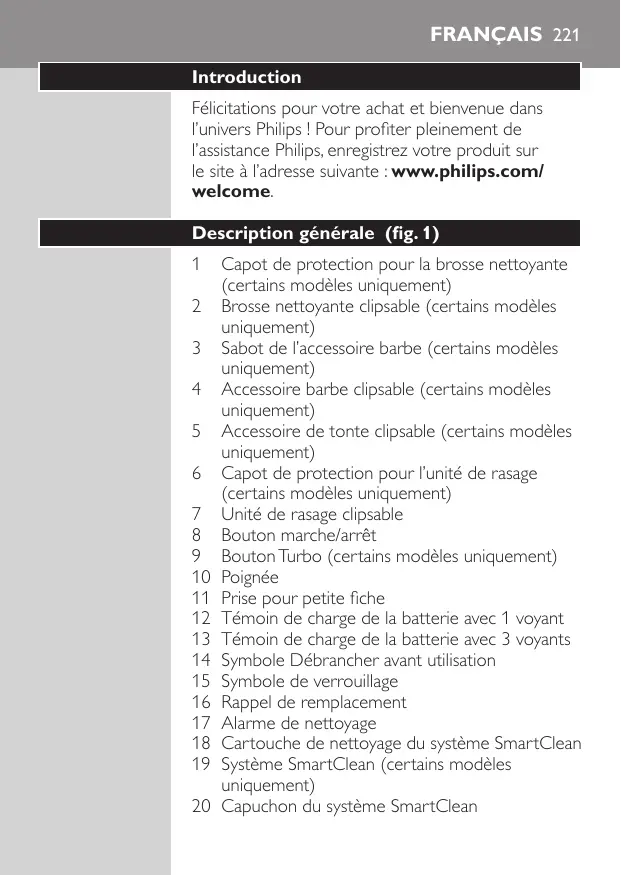 FRANÇAIS 221 Introduction Félicitations pour votre achat et bienvenue dans l’univers Philips ! Pour profiter pleinement de l’assistance Philips, enregistrez votre produit sur le site à l’adresse suivante : www.philips.com/ welcome. Description générale (fig. 1)