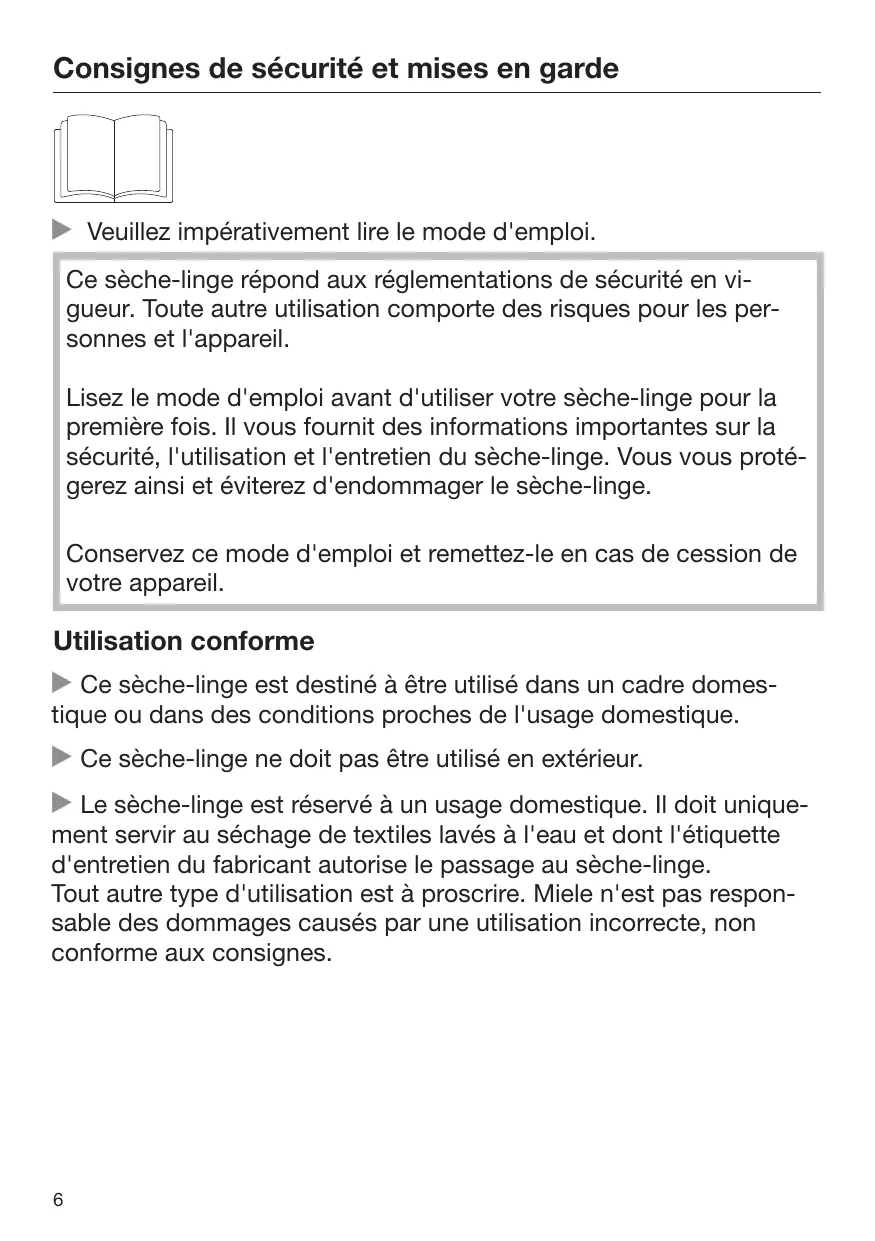 Consignes de sécurité et mises en garde Veuillez impérativement lire le mode d'emploi. Ce sèche-linge répond aux réglementations de sécurité en vigueur. Toute autre utilisation comporte des risques pour les personnes et l'appareil. Lisez le mode d'emploi avant d'utiliser votre sèche-linge pour la première fois. Il vous fournit des informations importantes sur la sécurité, l'utilisation et l'entretien du sèche-linge. Vous vous protégerez ainsi et éviterez d'endommager le sèche-linge. Conservez ce mode d'emploi et remettez-le en cas de cession de votre appareil. Utilisation conforme Ce sèche-linge est destiné à être utilisé dans un cadre domestique ou dans des conditions proches de l'usage domestique. Ce sèche-linge ne doit pas être utilisé en extérieur. Le sèche-linge est réservé à un usage domestique. Il doit uniquement servir au séchage de textiles lavés à l'eau et dont l'étiquette d'entretien du fabricant autorise le passage au sèche-linge. Tout autre type d'utilisation est à proscrire. Miele n'est pas responsable des dommages causés par une utilisation incorrecte, non conforme aux consignes.