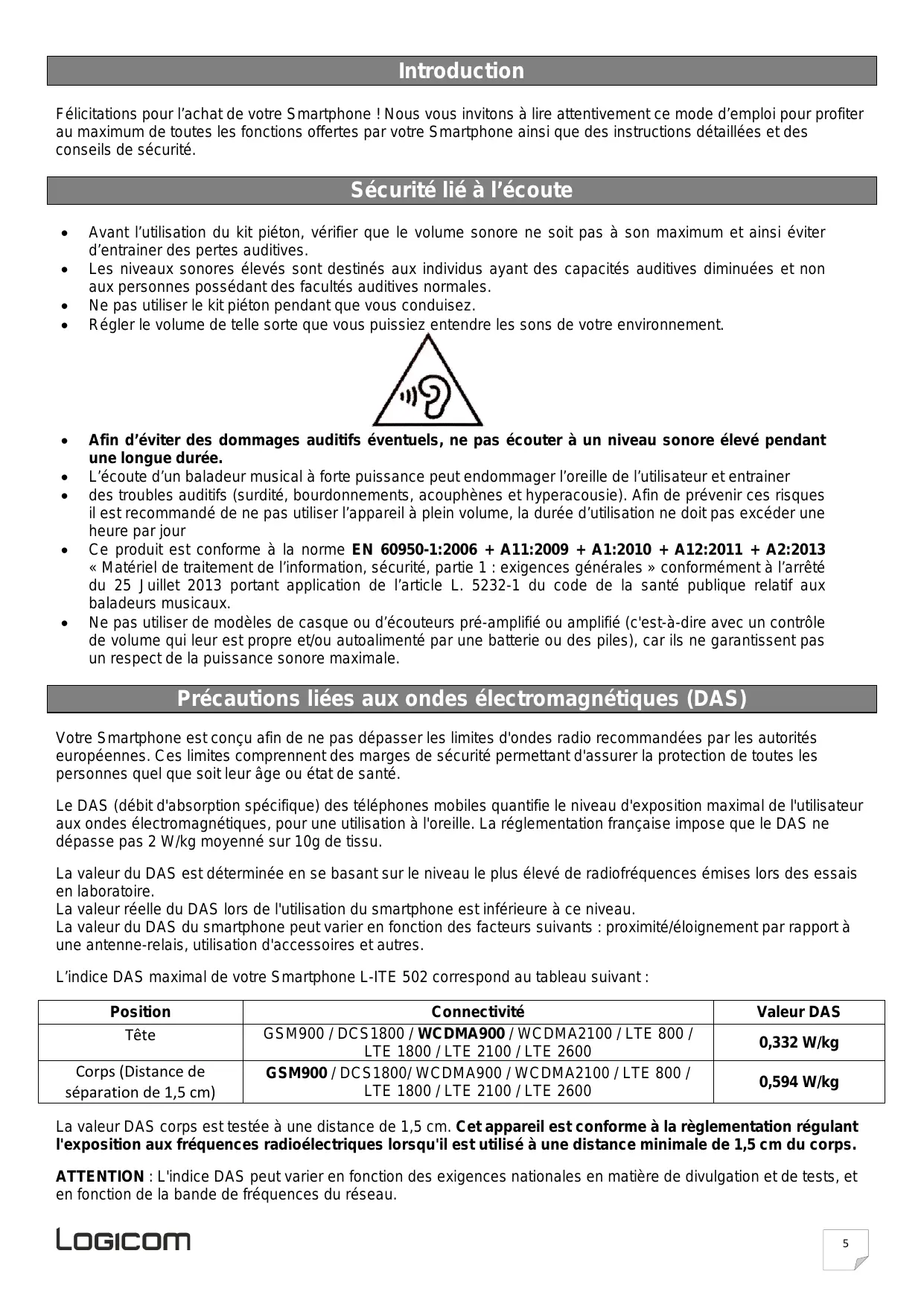 0700 Nous, LOGICOM (Logicom – 55 rue de Lisbonne – Paris 8ème – 75008 Paris) Déclarons que le produit Smartphone LOGICOM L-ITE 502 est en conformité avec les exigences essentielles de la Directive R&TTE 1999/05/CE applicables aux normes Européennes suivantes : EN 60950-1:2006 + A11:2009 + A1:2010+ A12 :2011 + A2: 2013 EN 50360:2001+A1:2012 EN 62209-1:2006 EN 62209-2:2010 EN 50566:2013 EN 62479:2010 EN 301 489-1 V1.9.2 EN 301 489-3 V1.4.1 EN 301 489-7 V1.3.1 EN 301 489-17 V2.2.1 EN 301 489-24 V1.5.1 EN 301 511 V9.0.2 EN 300 440-1 V1.6.1 EN 300 440-2 V1.4.1 EN 300 328 V1.8.1 EN 301 908-1 V6.2.1 EN 301 908-2 V6.2.1 EN 301 908-13 V6.2.1 ErP 2009/125/EC RoHS 2011/65/UE ErP 2009/125/EC - (No 278/2009 et 1275/2008): Concernant les exigences d’écoconception relatives à la consommation d’électricité hors charge et au rendement moyen en mode actif des sources d’alimentation externes. RoHs 2011/65/UE : Relative à la limitation de l’utilisation de certaines substances dangereuses dans les équipements électriques et électroniques. REACH Régulation N°1907/2006 : Concernant l'enregistrement, l'évaluation et l'autorisation des substances chimiques, ainsi que les restrictions applicables à ces substances. Le fabricant ne saurait être tenu responsable des modifications apportées par l’utilisateur et leurs conséquences, qui pourraient notamment affecter la conformité du produit avec le marquage CE, toute modification non autorisée du produit annule cette déclaration de conformité. Produit certifié par le laboratoire : PHOENIX TESTLAB GMBH Köningswinkel 10 32825 Blomberg Germany Numéro de laboratoire notifié : 0700 Paris, 8 Juin 2015. Bernard BESSIS Président Directeur Général