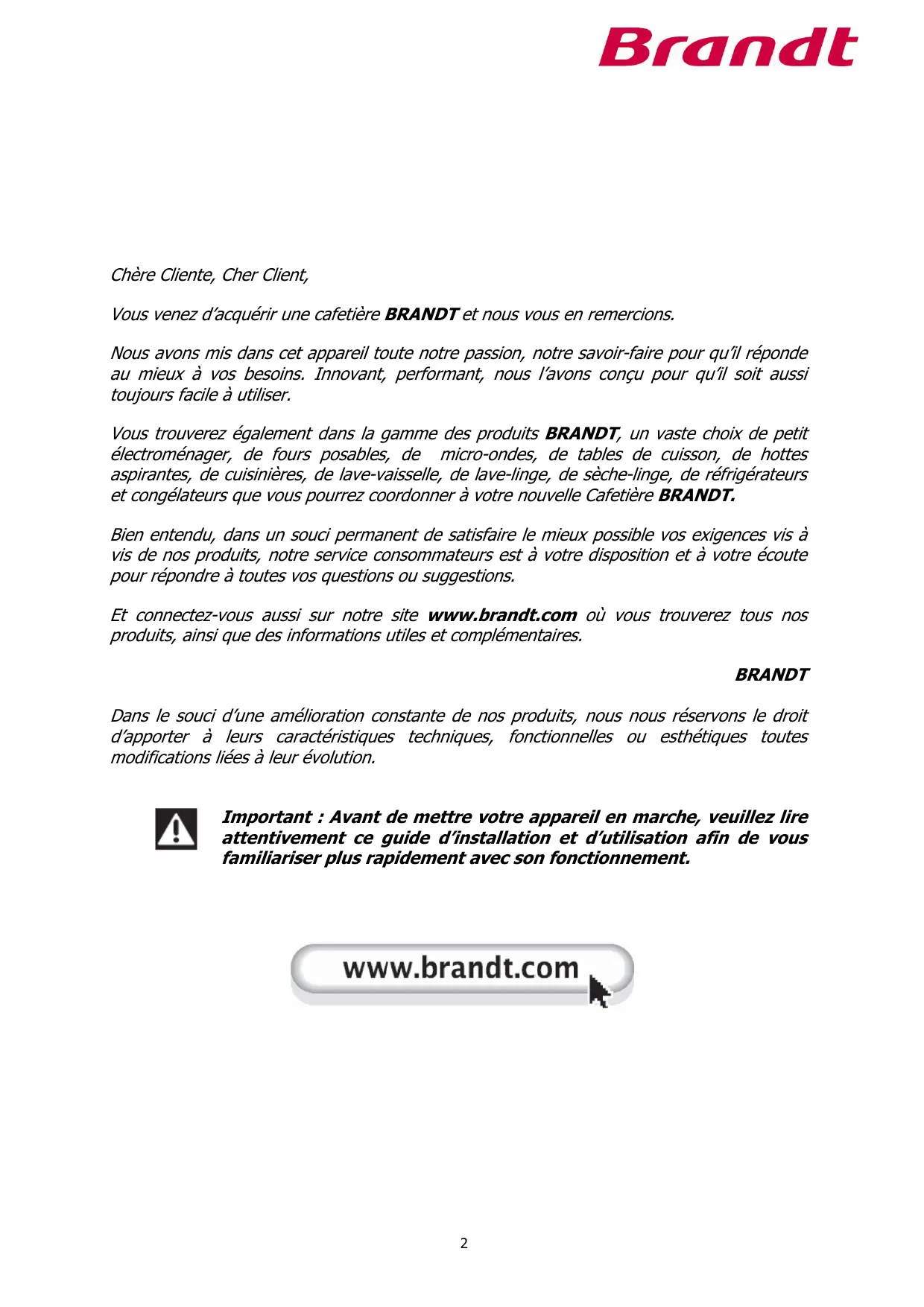 Et connectez-vous aussi sur notre site www.brandt.com où vous trouverez tous nos produits, ainsi que des informations utiles et complémentaires.