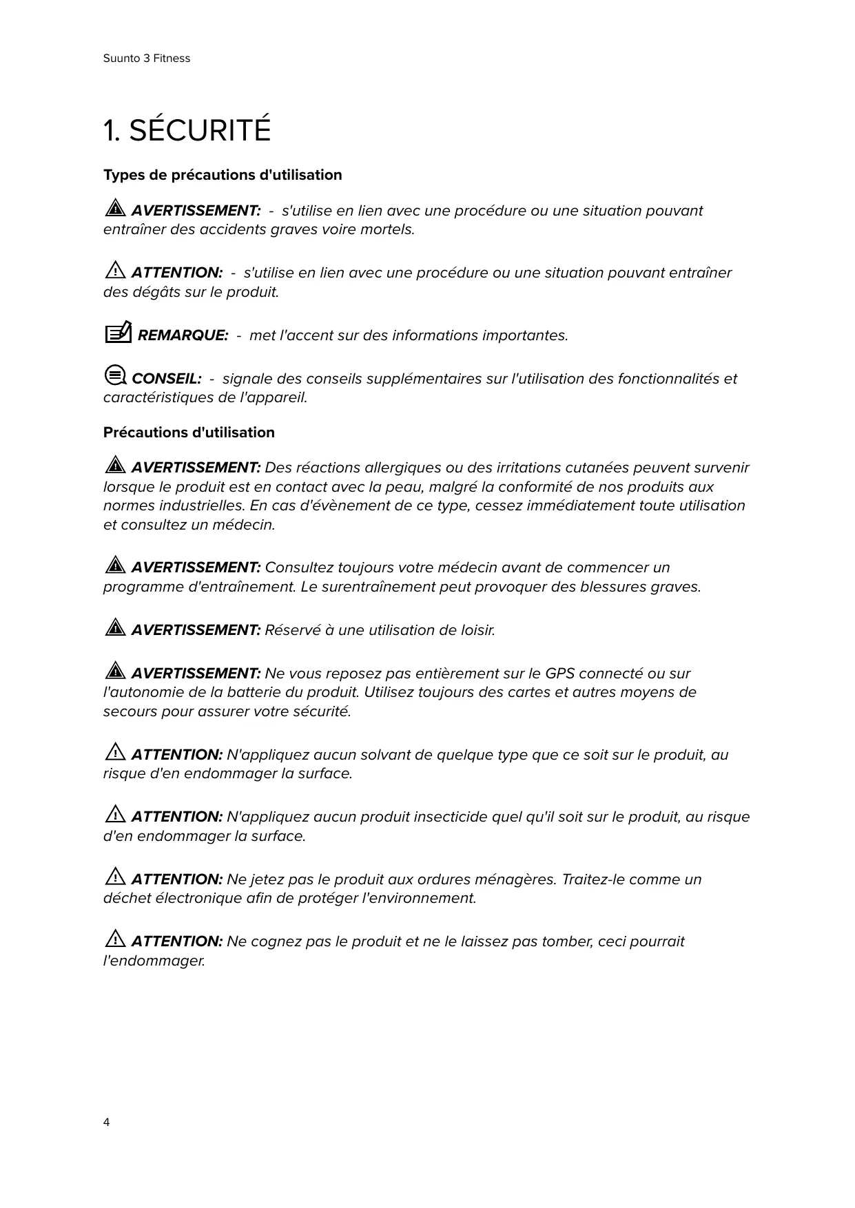 Suunto 3 Fitness REMARQUE: Chez Suunto, nous utilisons des capteurs et des algorithmes évolués pour produire les indicateurs qui vous aideront dans vos activités et dans vos aventures. Nous nous efforçons d'assurer la plus grande exactitude possible. Toutefois, aucune des données recueillies par nos produits et services n'est parfaitement fiable, tout comme la précision des indications qu'elles produisent. Il est possible que les calories, la fréquence cardiaque, l'emplacement, la détection des mouvements, la reconnaissance de tir, les indicateurs de stress physique et autres mesures ne correspondent pas à la réalité. Les produits et services Suunto sont destinés uniquement à une utilisation récréative et ne sont pas conçus à des fins médicales quelles qu'elles soient.