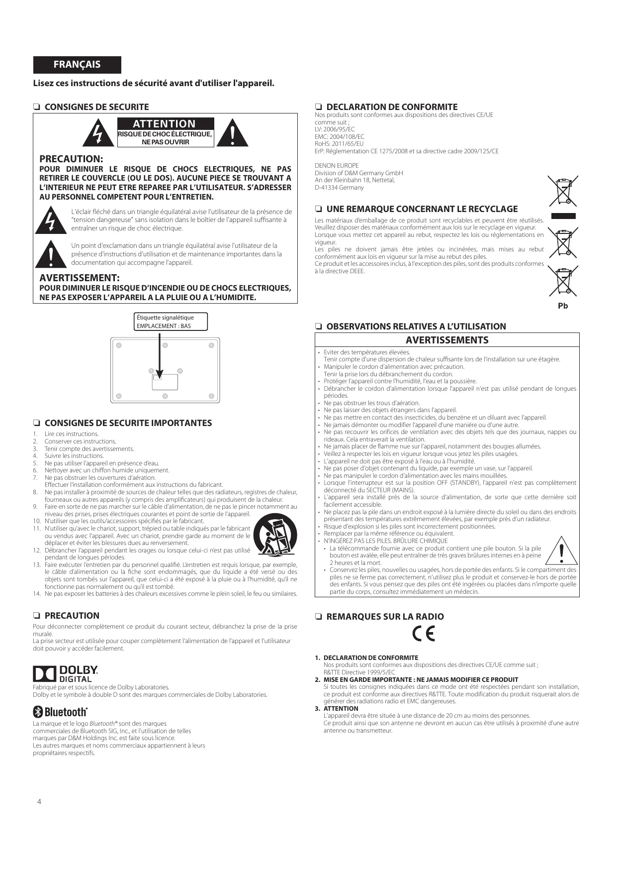 n DECLARATION DE CONFORMITE Nos produits sont conformes aux dispositions des directives CE/UE comme suit ; LV: 2006/95/EC EMC: 2004/108/EC RoHS: 2011/65/EU ErP: Réglementation CE 1275/2008 et sa directive cadre 2009/125/CE DENON EUROPE Division of D&M Germany GmbH An der Kleinbahn 18, Nettetal, D-41334 Germany