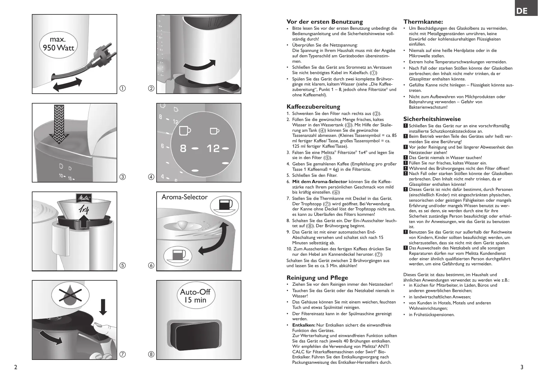 - Détartrage: Un détartrage régulier et dès les premières utilisations assure le bon fonctionnement de votre appareil. Melitta recommande de détartrer votre cafetière toutes les 40 utilisations avec le détartrant Cafetière ou le détartrant Appareils Electriques de Melitta. parties chaudes: risque de brûlure! ! Ne pas laisser l’appareil à la portée des enfants. ! Toujours débrancher l’appareil avant de le nettoyer ou pendant une absence prolongée. ! Ne jamais plonger l’appareil dans l’eau. ! Ne pas utiliser la verseuse isotherme dans un four à micro-ondes. ! Ne pas utiliser d’eau chaude. Mettre uniquement de l’eau fraîche dans le réservoir d’eau. préparation du café. ! Le verre de la verseuse peut se casser suite à une chute ou un choc violent. Ne pas boire le contenu car des débris de verre pourraient s’y trouver. ! Il n’est pas recommandé que l’appareil soit utilisé par des personnes (y compris des enfants) ayant des capacités mentales ou physiques limitées, ou bien sans expérience et/ou connaissance, à moins que ces personnes ne soient assistées par une personne responsable de leur sécurité qui leur donne des instructions quant à l’utilisation de l’appareil. ! Toujours mettre l’appareil hors de portée des enfants afin qu’ils ne puissent pas jouer avec l’appareil. ! Le remplacement du cordon d’alimentation ou d’autres parties doit être réalisé par Melitta® Customer Service ou par une personne de même qualification. Cet appareil est conçu pour être utilisé dans les foyers et pour une utilisation équivalente comme par ex. :