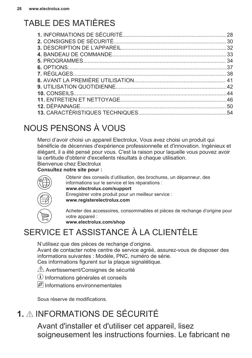 Avant de contacter notre centre de service agréé, assurez-vous de disposer des informations suivantes : Modèle, PNC, numéro de série. Ces informations figurent sur la plaque signalétique. Avertissement/Consignes de sécurité Informations générales et conseils Informations environnementales Sous réserve de modifications.