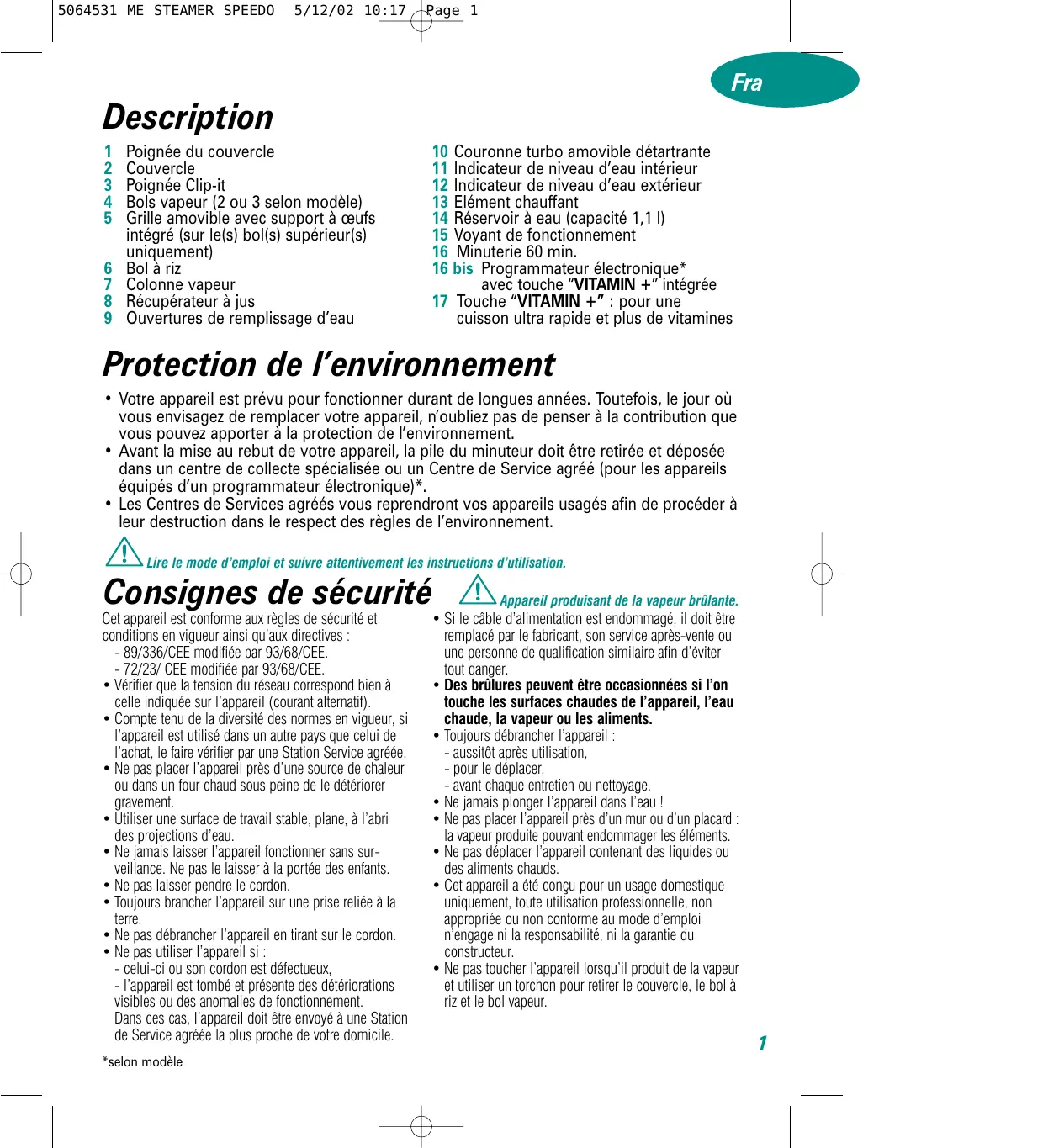 5/12/02 10:17 Page C5 SOMMAIRE Description................................................................ p. Protection de l’environnement ................................ p. Consignes de sécurité.............................................. p. Préparation................................................................ p. Cuisson vapeur avec minuterie .............................. p. Table des temps de cuisson .................................... p. Modèles avec programmateur électronique .......... p. Entretien et nettoyage .............................................. p.
