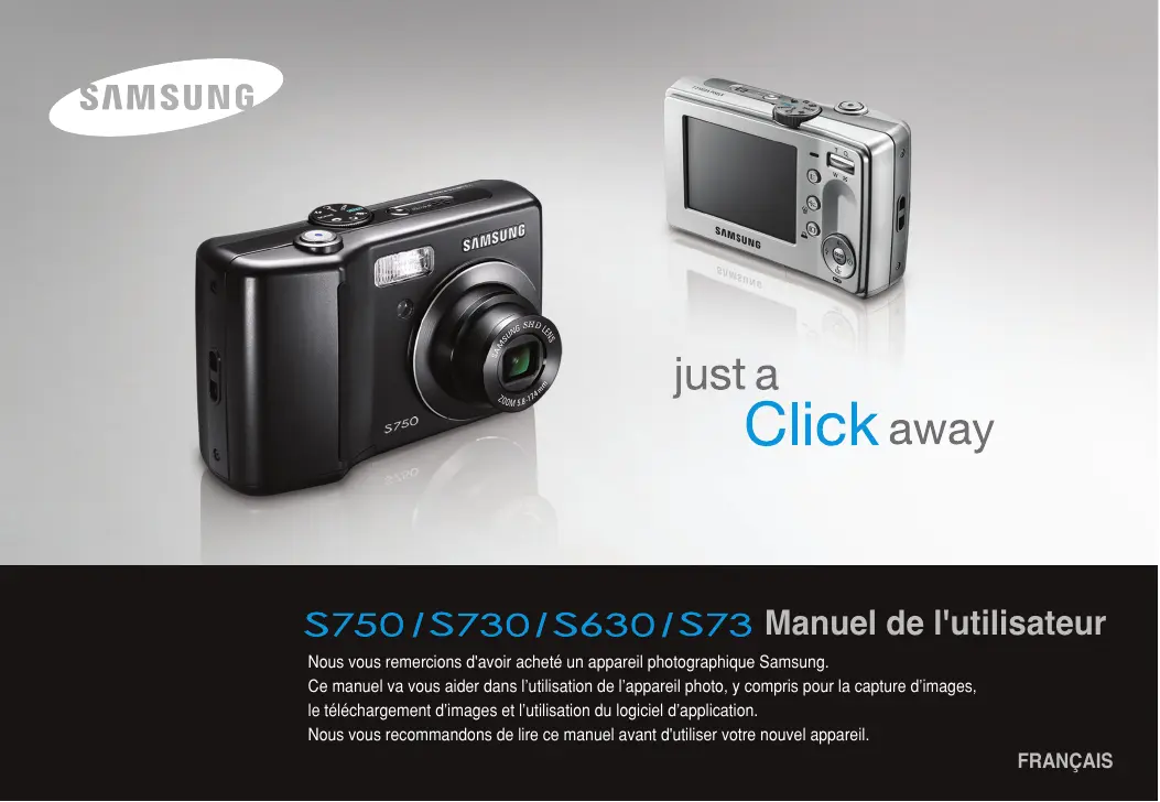 Manuel de l'utilisateur Nous vous remercions d'avoir acheté un appareil photographique Samsung. Ce manuel va vous aider dans l’utilisation de l’appareil photo, y compris pour la capture d’images, le téléchargement d’images et l’utilisation du logiciel d’application. Nous vous recommandons de lire ce manuel avant d'utiliser votre nouvel appareil.
